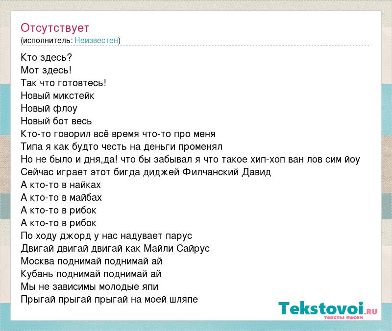 Кто здесь? Мот здесь! Так что готовтесь! Новый микстейк Новый флоу Новый бот весь Кто-то говорил всё время что-то про меня Типа я как будто честь на деньги променял Но не было и дня,да! что бы забывал я что такое хип-хоп ван лов сим йоу Сейчас играет этот бигда диджей Филчанский Давид А кто-то в найках А кто-то в майбах А кто-то в рибок А кто-то в рибок По ходу джорд у нас надувает парус Двигай двигай двигай как Майли Сайрус Москва поднимай поднимай ай Кубань поднимай поднимай ай Мы не зависимы молодые япи Прыгай прыгай прыгай на моей шляпе