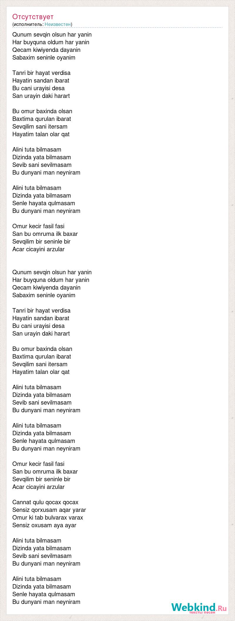 Qunum sevqin olsun har yanin Har buyquna oldum har yanin Qecam kiwiyenda dayanin Sabaxim seninle oyanim Tanri bir hayat verdisa Hayatin sandan ibarat Bu cani urayisi desa San urayin daki harart Bu omur baxinda olsan Baxtima qurulan ibarat Sevqilim sani itersam Hayatim talan olar qat Alini tuta bilmasam Dizinda yata bilmasam Sevib sani sevilmasam Bu dunyani man neyniram Alini tuta bilmasam Dizinda yata bilmasam Senle hayata qulmasam Bu dunyani man neyniram Omur kecir fasil fasi San bu omruma ilk baxar Sevqilim bir seninle bir Acar cicayini arzular Qunum sevqin olsun har yanin Har buyquna oldum har yanin Qecam kiwiyenda dayanin Sabaxim seninle oyanim Tanri bir hayat verdisa Hayatin sandan ibarat Bu cani urayisi desa San urayin daki harart Bu omur baxinda olsan Baxtima qurulan ibarat Sevqilim sani itersam Hayatim talan olar qat Alini tuta bilmasam Dizinda yata bilmasam Sevib sani sevilmasam Bu dunyani man neyniram Alini tuta bilmasam Dizinda yata bilmasam Senle hayata qulmasam Bu dunyani man neyniram Omur kecir fasil fasi San bu omruma ilk baxar Sevqilim bir seninle bir Acar cicayini arzular Cannat qulu qocax qocax Sensiz qorxusam aqar yarar Omur ki tab bulvarax varax Sensiz oxusam aya ayar Alini tuta bilmasam Dizinda yata bilmasam Sevib sani sevilmasam Bu dunyani man neyniram Alini tuta bilmasam Dizinda yata bilmasam Senle hayata qulmasam Bu dunyani man neyniram