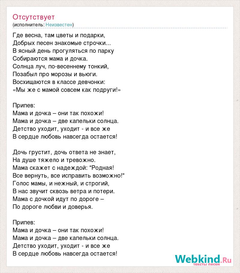 Где весна, там цветы и подарки, Добрых песен знакомые строчки... В ясный день прогуляться по парку Собираются мама и дочка. Солнца луч, по-весеннему тонкий, Позабыл про морозы и вьюги. Восхищаются в классе девчонки: «Мы же с мамой совсем как подруги!» Припев: Мама и дочка – они так похожи! Мама и дочка – две капельки солнца. Детство уходит, уходит - и все же В сердце любовь навсегда остается! Дочь грустит, дочь ответа не знает, На душе тяжело и тревожно. Мама скажет с надеждой: "Родная! Все вернуть, все исправить возможно!" Голос мамы, и нежный, и строгий, В нас звучит сквозь ветра и потери. Мама с дочкой идут по дороге – По дороге любви и доверья. Припев: Мама и дочка – они так похожи! Мама и дочка – две капельки солнца. Детство уходит, уходит - и все же В сердце любовь навсегда остается!