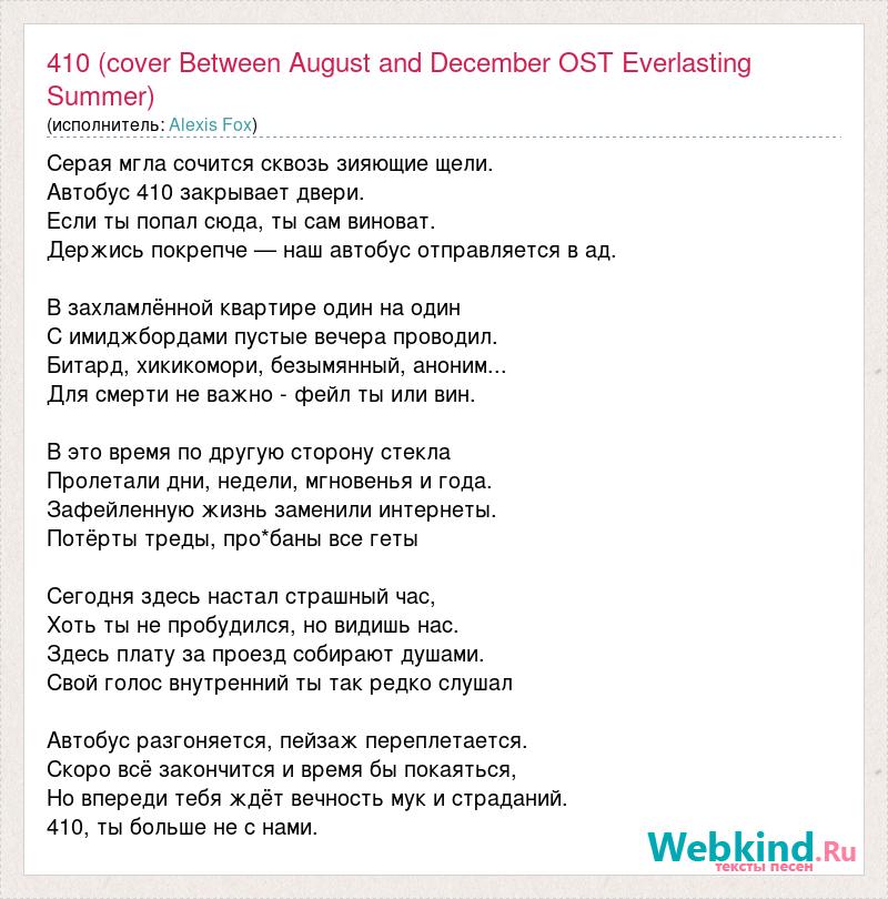 А как ты думаешь, о чем песня "410 (cover Between August and December OST Everlasting Summer)" ?