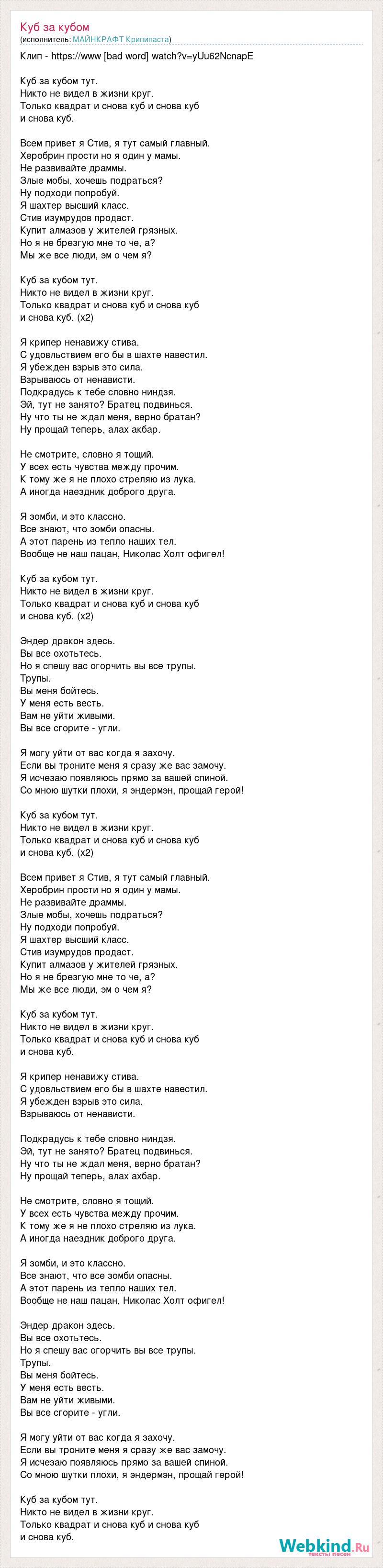 Клип - https://www [bad word] watch?v=yUu62NcnapE Куб за кубом тут. Никто не видел в жизни круг. Только квадрат и снова куб и снова куб и снова куб. Всем привет я Стив, я тут самый главный. Херобрин прости но я один у мамы. Не развивайте драммы. Злые мобы, хочешь подраться? Ну подходи попробуй. Я шахтер высший класс. Стив изумрудов продаст. Купит алмазов у жителей грязных. Но я не брезгую мне то че, а? Мы же все люди, эм о чем я? Куб за кубом тут. Никто не видел в жизни круг. Только квадрат и снова куб и снова куб и снова куб. (х2) Я крипер ненавижу стива. С удовльствием его бы в шахте навестил. Я убежден взрыв это сила. Взрываюсь от ненависти. Подкрадусь к тебе словно ниндзя. Эй, тут не занято? Братец подвинься. Ну что ты не ждал меня, верно братан? Ну прощай теперь, алах акбар. Не смотрите, словно я тощий. У всех есть чувства между прочим. К тому же я не плохо стреляю из лука. А иногда наездник доброго друга. Я зомби, и это классно. Все знают, что зомби опасны. А этот парень из тепло наших тел. Вообще не наш пацан, Николас Холт офигел! Куб за кубом тут. Никто не видел в жизни круг. Только квадрат и снова куб и снова куб и снова куб. (х2) Эндер дракон здесь. Вы все охотьтесь. Но я спешу вас огорчить вы все трупы. Трупы. Вы меня бойтесь. У меня есть весть. Вам не уйти живыми. Вы все сгорите - угли. Я могу уйти от вас когда я захочу. Если вы троните меня я сразу же вас замочу. Я исчезаю появляюсь прямо за вашей спиной. Со мною шутки плохи, я эндермэн, прощай герой! Куб за кубом тут. Никто не видел в жизни круг. Только квадрат и снова куб и снова куб и снова куб. (х2) Всем привет я Стив, я тут самый главный. Херобрин прости но я один у мамы. Не развивайте драммы. Злые мобы, хочешь подраться? Ну подходи попробуй. Я шахтер высший класс. Стив изумрудов продаст. Купит алмазов у жителей грязных. Но я не брезгую мне то че, а? Мы же все люди, эм о чем я? Куб за кубом тут. Никто не видел в жизни круг. Только квадрат и снова куб и снова куб и снова куб. Я крипер ненавижу стива. С удовльствием его бы в шахте навестил. Я убежден взрыв это сила. Взрываюсь от ненависти. Подкрадусь к тебе словно ниндзя. Эй, тут не занято? Братец подвинься. Ну что ты не ждал меня, верно братан? Ну прощай теперь, алах ахбар. Не смотрите, словно я тощий. У всех есть чувства между прочим. К тому же я не плохо стреляю из лука. А иногда наездник доброго друга. Я зомби, и это классно. Все знают, что все зомби опасны. А этот парень из тепло наших тел. Вообще не наш пацан, Николас Холт офигел! Эндер дракон здесь. Вы все охотьтесь. Но я спешу вас огорчить вы все трупы. Трупы. Вы меня бойтесь. У меня есть весть. Вам не уйти живыми. Вы все сгорите - угли. Я могу уйти от вас когда я захочу. Если вы троните меня я сразу же вас замочу. Я исчезаю появляюсь прямо за вашей спиной. Со мною шутки плохи, я эндермэн, прощай герой! Куб за кубом тут. Никто не видел в жизни круг. Только квадрат и снова куб и снова куб и снова куб.