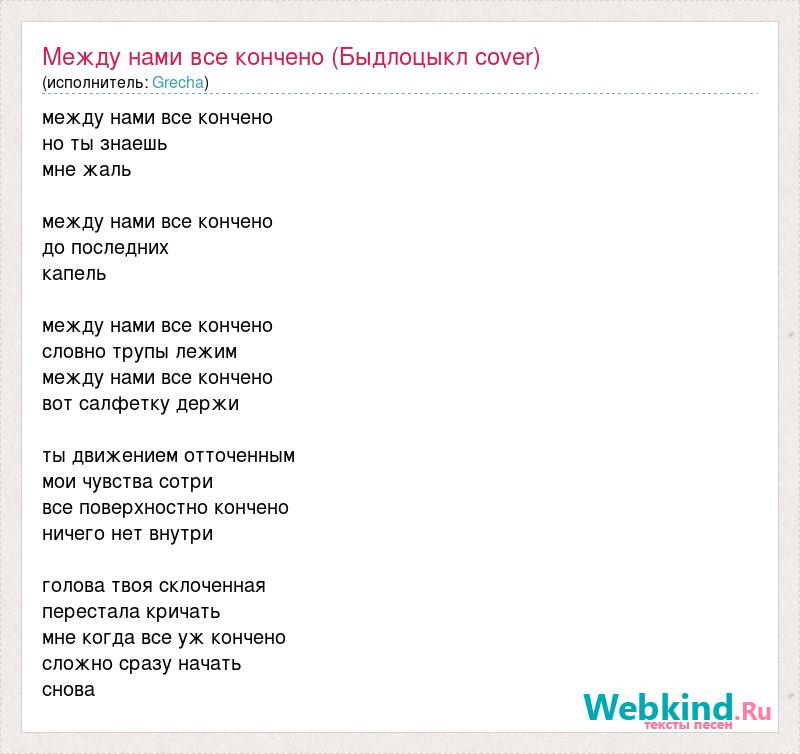 между нами все кончено но ты знаешь мне жаль между нами все кончено до последних капель между нами все кончено словно трупы лежим между нами все кончено вот салфетку держи ты движением отточенным мои чувства сотри все поверхностно кончено ничего нет внутри голова твоя склоченная перестала кричать мне когда все уж кончено сложно сразу начать снова