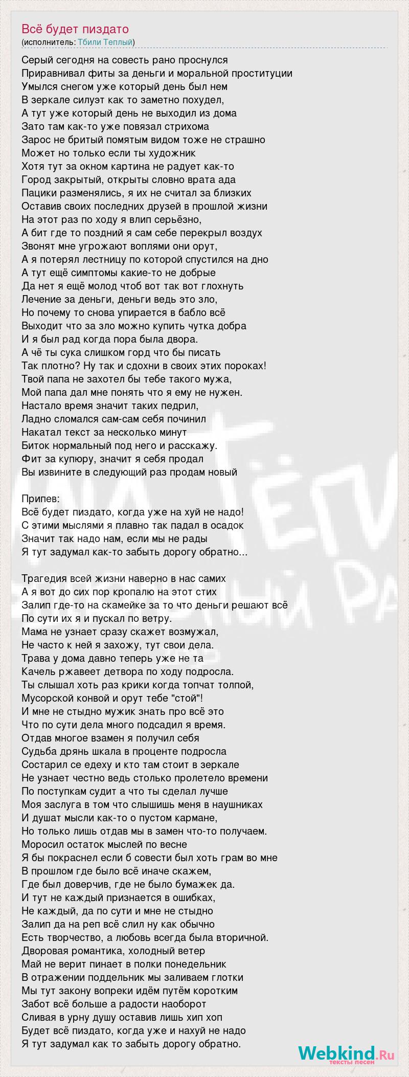 Серый сегодня на совесть рано проснулся Приравнивал фиты за деньги и моральной проституции Умылся снегом уже который день был нем В зеркале силуэт как то заметно похудел, А тут уже который день не выходил из дома Зато там как-то уже повязал стрихома Зарос не бритый помятым видом тоже не страшно Может но только если ты художник Хотя тут за окном картина не радует как-то Город закрытый, открыты словно врата ада Пацики разменялись, я их не считал за близких Оставив своих последних друзей в прошлой жизни На этот раз по ходу я влип серьёзно, А бит где то поздний я сам себе перекрыл воздух Звонят мне угрожают воплями они орут, А я потерял лестницу по которой спустился на дно А тут ещё симптомы какие-то не добрые Да нет я ещё молод чтоб вот так вот глохнуть Лечение за деньги, деньги ведь это зло, Но почему то снова упирается в бабло всё Выходит что за зло можно купить чутка добра И я был рад когда пора была двора. А чё ты сука слишком горд что бы писать Так плотно? Ну так и сдохни в своих этих пороках! Твой папа не захотел бы тебе такого мужа, Мой папа дал мне понять что я ему не нужен. Настало время значит таких педрил, Ладно сломался сам-сам себя починил Накатал текст за несколько минут Биток нормальный под него и расскажу. Фит за купюру, значит я себя продал Вы извините в следующий раз продам новый Припев: Всё будет пиздато, когда уже на хуй не надо! С этими мыслями я плавно так падал в осадок Значит так надо нам, если мы не рады Я тут задумал как-то забыть дорогу обратно... Трагедия всей жизни наверно в нас самих А я вот до сих пор кропалю на этот стих Залип где-то на скамейке за то что деньги решают всё По сути их я и пускал по ветру. Мама не узнает сразу скажет возмужал, Не часто к ней я захожу, тут свои дела. Трава у дома давно теперь уже не та Качель ржавеет детвора по ходу подросла. Ты слышал хоть раз крики когда топчат толпой, Мусорской конвой и орут тебе "стой"! И мне не стыдно мужик знать про всё это Что по сути дела много подсадил я время. Отдав многое взамен я получил себя Судьба дрянь шкала в проценте подросла Состарил се едеху и кто там стоит в зеркале Не узнает честно ведь столько пролетело времени По поступкам судит а что ты сделал лучше Моя заслуга в том что слышишь меня в наушниках И душат мысли как-то о пустом кармане, Но только лишь отдав мы в замен что-то получаем. Моросил остаток мыслей по весне Я бы покраснел если б совести был хоть грам во мне В прошлом где было всё иначе скажем, Где был доверчив, где не было бумажек да. И тут не каждый признается в ошибках, Не каждый, да по сути и мне не стыдно Залип да на реп всё слил ну как обычно Есть творчество, а любовь всегда была вторичной. Дворовая романтика, холодный ветер Май не верит пинает в полки понедельник В отражении поддельник мы заливаем глотки Мы тут закону вопреки идём путём коротким Забот всё больше а радости наоборот Сливая в урну душу оставив лишь хип хоп Будет всё пиздато, когда уже и нахуй не надо Я тут задумал как то забыть дорогу обратно.