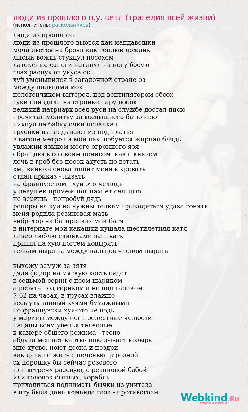 люди из прошлого. люди из прошлого вьются как мандавошки моча льется на брови как теплый дождик лысый вождь стукнул посохом латексные сапоги натянул на ногу босую глаз распух от укуса ос хуй уменьшился в загадочной стране оз между пальцами мох полотенчиком вытерся, под вентилятором обсох гуки спиздили на стройке пару досок великий патриарх всея руси на службе достал писю прочитал молитву за всевышнего батю изю чихнул на бабку,очки испачкал трусики выглядывают из под платья в вагоне метро на мой пах любуется жирная блядь увлажни языком моего огромного язя обращаюсь со своим пенисом как с князем лечь в гроб без носок-ахуеть не встать хм,свинюха снова тащит меня в кровать отдан приказ - лизать на французском - хуй это челюдь у девушек промеж ног пахнет сельдью не веришь - попробуй дядь реперы на хуй не нужны телкам приходиться удава гонять меня родила резиновая мать вибратор на батарейках мой батя в интернате мои какашки кушала шестилетняя катя лизер люблю слюнками запивать прыщи на хую ногтем ковырять телкам нырять, между пальцев членом пырять выхожу замуж за зятя дядя федор на мягкую кость сядет в седьмой серии с псом шариком а ребята под гериком а не под гариком 7:62 на часах, в трусах влажно весь утыканный хуями бумажными по французски хуй-это челюдь у марины между ног прелестные челюсти пацаны всем увечья телесные в камере общего режима - тесно абдула мешает карты- показывает козырь мне хуево, ноют десна и ноздри как дальше жить с печенью цирозной эх порошку бы сейчас розового или встречу разовую, с резиновой бабой или головок сытных, корабль приходиться поднимать бычки из унитаза в пту была дана команда газа - противогазы