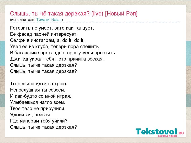 Готовить не умеет, зато как танцует, Ее фасад парней интересует. Селфи в инстаграм, а, do it, do it, Увел ее из клуба, теперь пора спешить. В багажнике прохладно, прошу меня простить. Джигид украл тебя - это причина веская. Слышь, ты че такая дерзкая? Слышь, ты че такая дерзкая? Ты решила идти по краю. Непослушная ты совсем. И как-будто со мной играя. Улыбаешься нагло всем. Твое тело не приручили. Ядовитая, резвая. Где манерам тебя учили? Слышь, ты че такая дерзкая?