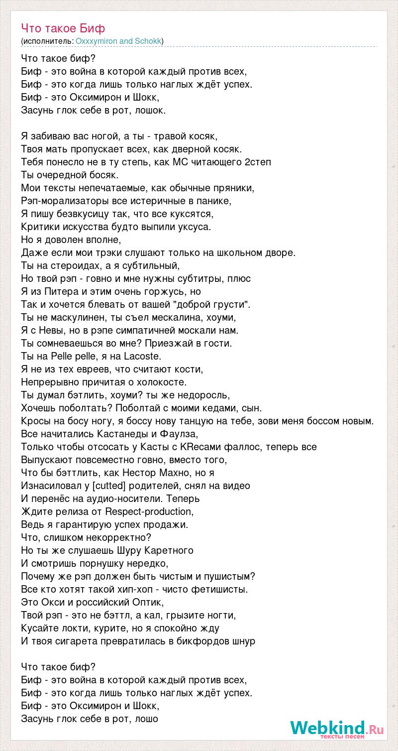 Что такое биф? Биф - это война в которой каждый против всех, Биф - это когда лишь только наглых ждёт успех. Биф - это Оксимирон и Шокк, Засунь глок себе в рот, лошок. Я забиваю вас ногой, а ты - травой косяк, Твоя мать пропускает всех, как дверной косяк. Тебя понесло не в ту степь, как MC читающего 2степ Ты очередной босяк. Мои тексты непечатаемые, как обычные пряники, Рэп-морализаторы все истеричные в панике, Я пишу безвкусицу так, что все куксятся, Критики искусства будто выпили уксуса. Но я доволен вполне, Даже если мои трэки слушают только на школьном дворе. Ты на стероидах, а я субтильный, Но твой рэп - говно и мне нужны субтитры, плюс Я из Питера и этим очень горжусь, но Так и хочется блевать от вашей "доброй грусти". Ты не маскулинен, ты съел мескалина, хоуми, Я с Невы, но в рэпе симпатичней москали нам. Ты сомневаешься во мне? Приезжай в гости. Ты на Pelle pelle, я на Lacoste. Я не из тех евреев, что считают кости, Непрерывно причитая о холокосте. Ты думал бэтлить, хоуми? ты же недоросль, Хочешь поболтать? Поболтай с моими кедами, сын. Кросы на босу ногу, я боссу нову танцую на тебе, зови меня боссом новым. Все начитались Кастанеды и Фаулза, Только чтобы отсосать у Касты с KRecами фаллос, теперь все Выпускают повсеместно говно, вместо того, Что бы бэттлить, как Нестор Махно, но я Изнасиловал у [cutted] родителей, снял на видео И перенёс на аудио-носители. Теперь Ждите релиза от Respect-production, Ведь я гарантирую успех продажи. Что, слишком некорректно? Но ты же слушаешь Шуру Каретного И смотришь порнушку нередко, Почему же рэп должен быть чистым и пушистым? Все кто хотят такой хип-хоп - чисто фетишисты. Это Окси и российский Оптик, Твой рэп - это не бэттл, а кал, грызите ногти, Кусайте локти, курите, но я спокойно жду И твоя сигарета превратилась в бикфордов шнур Что такое биф? Биф - это война в которой каждый против всех, Биф - это когда лишь только наглых ждёт успех. Биф - это Оксимирон и Шокк, Засунь глок себе в рот, лошо