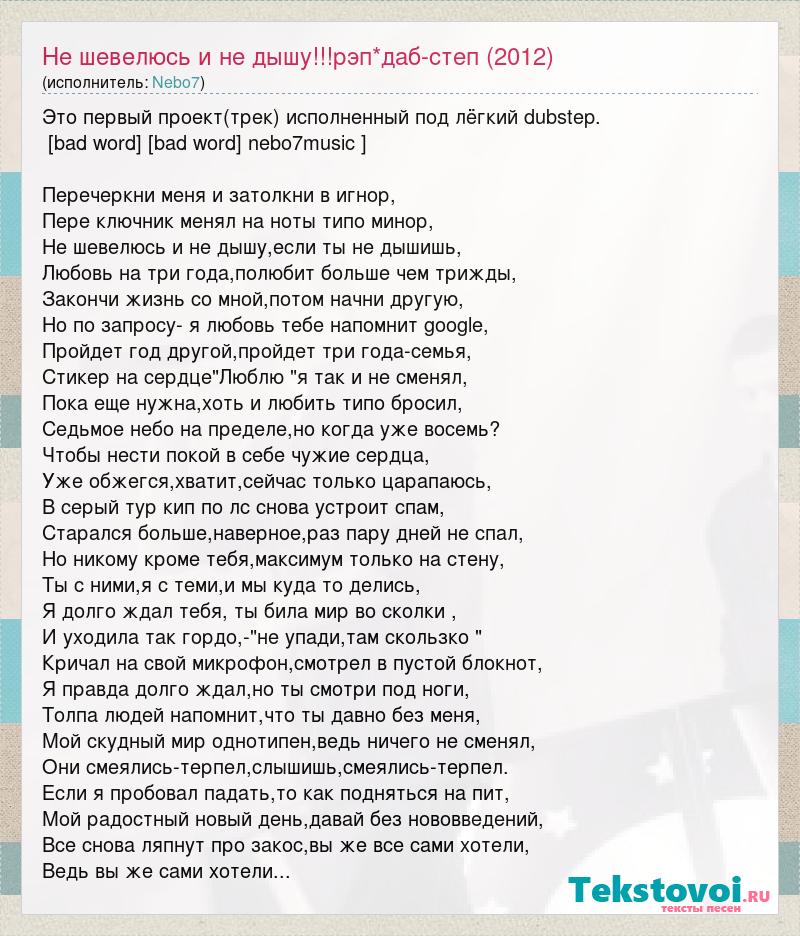 Это первый проект(трек) исполненный под лёгкий dubstep. [bad word] [bad word] nebo7music ] Перечеркни меня и затолкни в игнор, Пере ключник менял на ноты типо минор, Не шевелюсь и не дышу,если ты не дышишь, Любовь на три года,полюбит больше чем трижды, Закончи жизнь со мной,потом начни другую, Но по запросу- я любовь тебе напомнит google, Пройдет год другой,пройдет три года-семья, Стикер на сердце"Люблю "я так и не сменял, Пока еще нужна,хоть и любить типо бросил, Седьмое небо на пределе,но когда уже восемь? Чтобы нести покой в себе чужие сердца, Уже обжегся,хватит,сейчас только царапаюсь, В серый тур кип по лс снова устроит спам, Старался больше,наверное,раз пару дней не спал, Но никому кроме тебя,максимум только на стену, Ты с ними,я с теми,и мы куда то делись, Я долго ждал тебя, ты била мир во сколки , И уходила так гордо,-"не упади,там скользко " Кричал на свой микрофон,смотрел в пустой блокнот, Я правда долго ждал,но ты смотри под ноги, Толпа людей напомнит,что ты давно без меня, Мой скудный мир однотипен,ведь ничего не сменял, Они смеялись-терпел,слышишь,смеялись-терпел. Если я пробовал падать,то как подняться на пит, Мой радостный новый день,давай без нововведений, Все снова ляпнут про закос,вы же все сами хотели, Ведь вы же сами хотели...