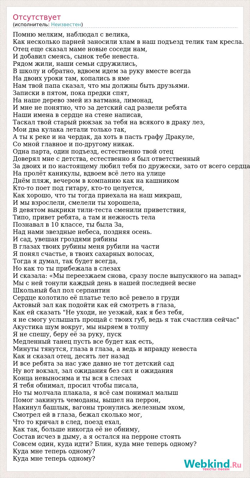 Помню мелким, наблюдал с велика, Как несколько парней заносили хлам в наш подъезд телик там кресла. Отец еще сказал маме новые соседи нам, И добавил смеясь, сынок тебе невеста. Рядом жили, наши семьи сдружились, В школу и обратно, вдвоем идем за руку вместе всегда На двоих уроки там, копались в яме Нам твой папа сказал, что мы должны быть друзьями. Записки в пятом, пока предки спят, На наше дерево змей из ватмана, лимонад, И мне не понятно, что за детский сад развели ребята Наши имена в сердце на стене написав, Таскал твой старый рюкзак за тебя на всякого в драку лез, Мои два кулака летали только так, А ты к реке и на чердак, да хоть в пасть графу Дракуле, Со мной главное и по-другому никак. Одна парта, один подъезд, естественно твой отец Доверял мне с детства, естественно я был ответственный За двоих и по настоящему любил тебя по дружески, зато от всего сердца На пролёт каникулы, вдвоем всё лето на улице Днём пляж, вечером в компанию как на кашником Кто-то поет под гитару, кто-то целуется, Как хорошо, что ты тогда приехала на наш микраш, И мы взрослели, смелели ты хорошела, В девятом выкрики тили-теста сменили приветствия, Типо, привет ребята, а там и нежность тела Познавал в 10 классе, ты была За, Над нами звездные небеса, поздняя осень. И сад, увешан гроздями рябины В глазах твоих рубины меня рубили на части Я понял счастье, в твоих сахарных волосах, Тогда я думал, так будет всегда, Но как то ты прибежала в слезах И сказала: «Мы переезжаем снова, сразу после выпускного на запад» Мы с ней тонули каждый день в нашей последней весне Школьный бал пол серпантин Сердце колотило её платье тело всё ревело в груди Актовый зал как подойти как ей смотреть в глаза, Как ей сказать "Не уходи, не уезжай, как я без тебя, я не смогу услышать прощай с твоих губ, ведь я так счастлив сейчас" Акустика шум вокруг, мы ныряем в толпу Я не спешу, беру её за руку, пуск Медленный танец пусть все будет как есть, Минуты тянутся, глаза в глаза, а ведь и вправду невеста Как и сказал отец, десять лет назад И все ребята за нас уже давно не тот детский сад Ну вот вокзал, зал ожидания без сил и ожидания Конца невыносима и ты вся в слезах Я тебя обнимал, просил чтобы писала, Но ты молчала плакала, я всё сам понимал малыш Помог закинуть чемоданы, вышел на перрон, Накинул башлык, вагоны тронулись железным эхом, Смотрел ей в глаза, бежал сколько мог, Что то кричал в след, поезд ехал, Как так, больше никогда её не обниму, Состав исчез в дыму, а я остался на перроне стоять Совсем один, куда идти? Блин, куда мне теперь одному? Куда мне теперь одному? Куда мне теперь одному?