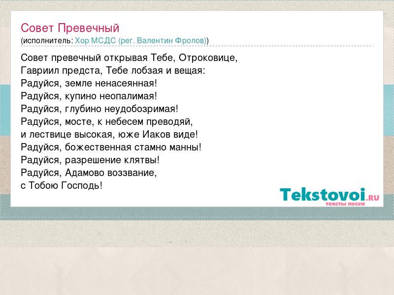 Совет превечный открывая Тебе, Отроковице, Гавриил предста, Тебе лобзая и вещая: Радуйся, земле ненасеянная! Радуйся, купино неопалимая! Радуйся, глубино неудобозримая! Радуйся, мосте, к небесем преводяй, и лествице высокая, юже Иаков виде! Радуйся, божественная стамно манны! Радуйся, разрешение клятвы! Радуйся, Адамово воззвание, с Тобою Господь!