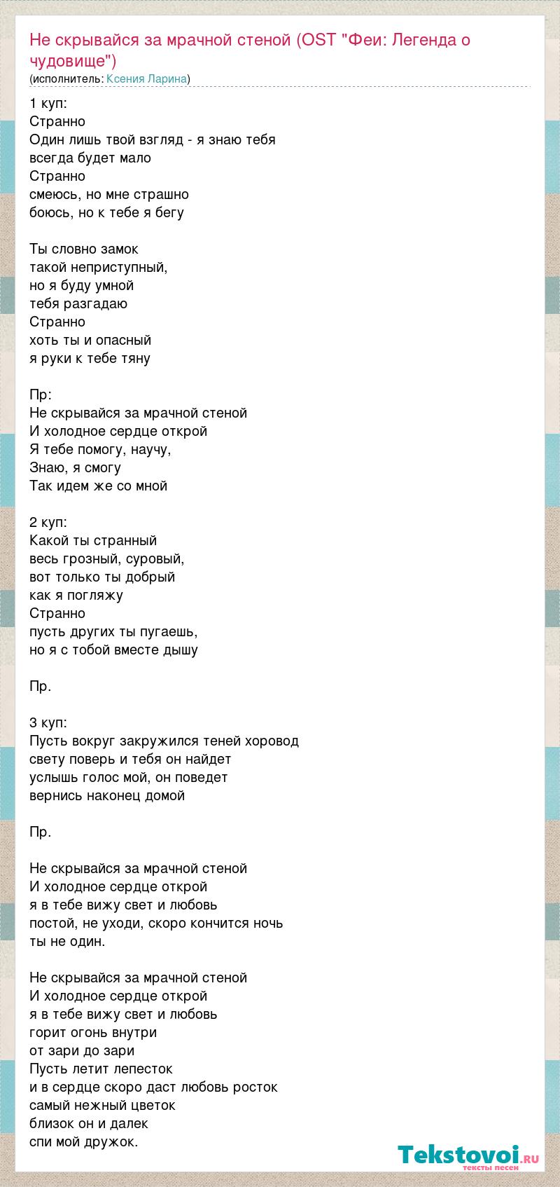 1 куп: Странно Один лишь твой взгляд - я знаю тебя всегда будет мало Странно смеюсь, но мне страшно боюсь, но к тебе я бегу Ты словно замок такой неприступный, но я буду умной тебя разгадаю Странно хоть ты и опасный я руки к тебе тяну Пр: Не скрывайся за мрачной стеной И холодное сердце открой Я тебе помогу, научу, Знаю, я смогу Так идем же со мной 2 куп: Какой ты странный весь грозный, суровый, вот только ты добрый как я погляжу Странно пусть других ты пугаешь, но я с тобой вместе дышу Пр. 3 куп: Пусть вокруг закружился теней хоровод свету поверь и тебя он найдет услышь голос мой, он поведет вернись наконец домой Пр. Не скрывайся за мрачной стеной И холодное сердце открой я в тебе вижу свет и любовь постой, не уходи, скоро кончится ночь ты не один. Не скрывайся за мрачной стеной И холодное сердце открой я в тебе вижу свет и любовь горит огонь внутри от зари до зари Пусть летит лепесток и в сердце скоро даст любовь росток самый нежный цветок близок он и далек спи мой дружок.