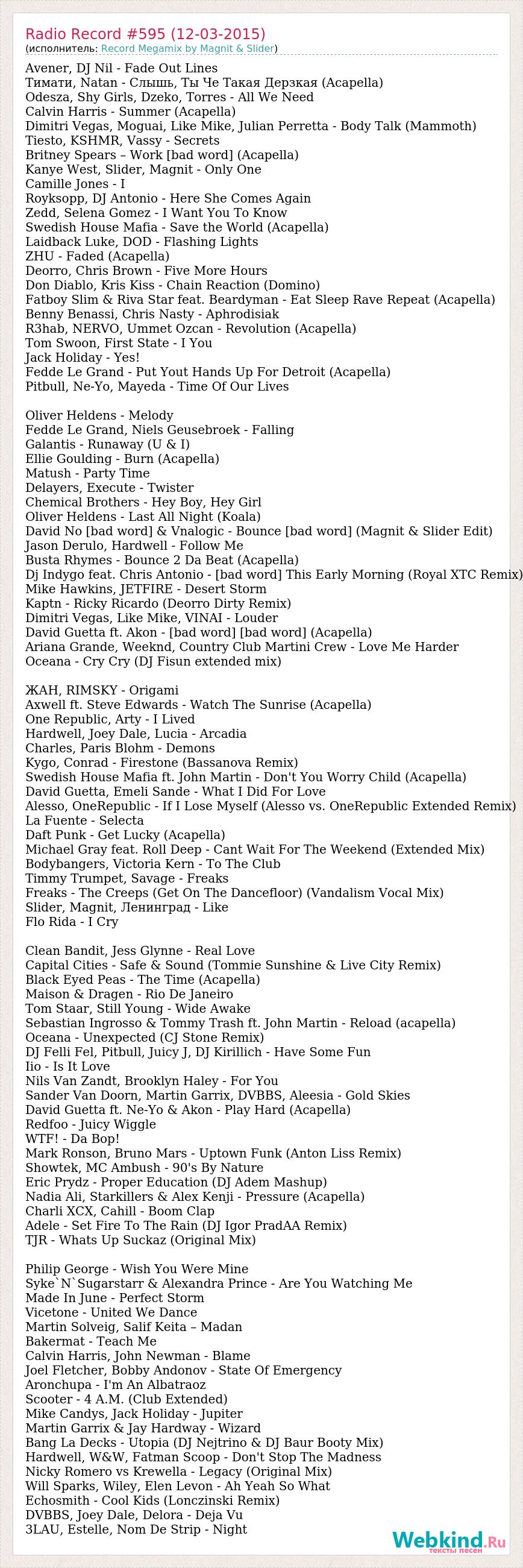 Avener, DJ Nil - Fade Out Lines Тимати, Natan - Слышь, Ты Че Такая Дерзкая (Acapella) Odesza, Shy Girls, Dzeko, Torres - All We Need Calvin Harris - Summer (Acapella) Dimitri Vegas, Moguai, Like Mike, Julian Perretta - Body Talk (Mammoth) Tiesto, KSHMR, Vassy - Secrets Britney Spears – Work [bad word] (Acapella) Kanye West, Slider, Magnit - Only One Camille Jones - I Royksopp, DJ Antonio - Here She Comes Again Zedd, Selena Gomez - I Want You To Know Swedish House Mafia - Save the World (Acapella) Laidback Luke, DOD - Flashing Lights ZHU - Faded (Acapella) Deorro, Chris Brown - Five More Hours Don Diablo, Kris Kiss - Chain Reaction (Domino) Fatboy Slim & Riva Star feat. Beardyman - Eat Sleep Rave Repeat (Acapella) Benny Benassi, Chris Nasty - Aphrodisiak R3hab, NERVO, Ummet Ozcan - Revolution (Acapella) Tom Swoon, First State - I You Jack Holiday - Yes! Fedde Le Grand - Put Yout Hands Up For Detroit (Acapella) Pitbull, Ne-Yo, Mayeda - Time Of Our Lives Oliver Heldens - Melody Fedde Le Grand, Niels Geusebroek - Falling Galantis - Runaway (U & I) Ellie Goulding - Burn (Acapella) Matush - Party Time Delayers, Execute - Twister Chemical Brothers - Hey Boy, Hey Girl Oliver Heldens - Last All Night (Koala) David No [bad word] & Vnalogic - Bounce [bad word] (Magnit & Slider Edit) Jason Derulo, Hardwell - Follow Me Busta Rhymes - Bounce 2 Da Beat (Acapella) Dj Indygo feat. Chris Antonio - [bad word] This Early Morning (Royal XTC Remix) Mike Hawkins, JETFIRE - Desert Storm Kaptn - Ricky Ricardo (Deorro Dirty Remix) Dimitri Vegas, Like Mike, VINAI - Louder David Guetta ft. Akon - [bad word] [bad word] (Acapella) Ariana Grande, Weeknd, Country Club Martini Crew - Love Me Harder Oceana - Cry Cry (DJ Fisun extended mix) ЖАН, RIMSKY - Origami Axwell ft. Steve Edwards - Watch The Sunrise (Acapella) One Republic, Arty - I Lived Hardwell, Joey Dale, Lucia - Arcadia Charles, Paris Blohm - Demons Kygo, Conrad - Firestone (Bassanova Remix) Swedish House Mafia ft. John Martin - Don't You Worry Child (Acapella) David Guetta, Emeli Sande - What I Did For Love Alesso, OneRepublic - If I Lose Myself (Alesso vs. OneRepublic Extended Remix) La Fuente - Selecta Daft Punk - Get Lucky (Acapella) Michael Gray feat. Roll Deep - Cant Wait For The Weekend (Extended Mix) Bodybangers, Victoria Kern - To The Club Timmy Trumpet, Savage - Freaks Freaks - The Creeps (Get On The Dancefloor) (Vandalism Vocal Mix) Slider, Magnit, Ленинград - Like Flo Rida - I Cry Clean Bandit, Jess Glynne - Real Love Capital Cities - Safe & Sound (Tommie Sunshine & Live City Remix) Black Eyed Peas - The Time (Acapella) Maison & Dragen - Rio De Janeiro Tom Staar, Still Young - Wide Awake Sebastian Ingrosso & Tommy Trash ft. John Martin - Reload (acapella) Oceana - Unexpected (CJ Stone Remix) DJ Felli Fel, Pitbull, Juicy J, DJ Kirillich - Have Some Fun Iio - Is It Love Nils Van Zandt, Brooklyn Haley - For You Sander Van Doorn, Martin Garrix, DVBBS, Aleesia - Gold Skies David Guetta ft. Ne-Yo & Akon - Play Hard (Acapella) Redfoo - Juicy Wiggle WTF! - Da Bop! Mark Ronson, Bruno Mars - Uptown Funk (Anton Liss Remix) Showtek, MC Ambush - 90's By Nature Eric Prydz - Proper Education (DJ Adem Mashup) Nadia Ali, Starkillers & Alex Kenji - Pressure (Acapella) Charli XCX, Cahill - Boom Clap Adele - Set Fire To The Rain (DJ Igor PradAA Remix) TJR - Whats Up Suckaz (Original Mix) Philip George - Wish You Were Mine Syke`N`Sugarstarr & Alexandra Prince - Are You Watching Me Made In June - Perfect Storm Vicetone - United We Dance Martin Solveig, Salif Keita – Madan Bakermat - Teach Me Calvin Harris, John Newman - Blame Joel Fletcher, Bobby Andonov - State Of Emergency Aronchupa - I'm An Albatraoz Scooter - 4 A.M. (Club Extended) Mike Candys, Jack Holiday - Jupiter Martin Garrix & Jay Hardway - Wizard Bang La Decks - Utopia (DJ Nejtrino & DJ Baur Booty Mix) Hardwell, W&W, Fatman Scoop - Don't Stop The Madness Nicky Romero vs Krewella - Legacy (Original Mix) Will Sparks, Wiley, Elen Levon - Ah Yeah So What Echosmith - Cool Kids (Lonczinski Remix) DVBBS, Joey Dale, Delora - Deja Vu 3LAU, Estelle, Nom De Strip - Night
