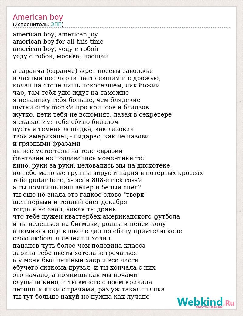 american boy, american joy american boy for all this time american boy, уеду с тобой уеду с тобой, москва, прощай а саранча (саранча) жрет посевы заволжья и чахлый пес чарли лает севшим и с дрожью, кочан на столе лишь покосевшем, лик божий чао, там тебя уже ждут на таможне я ненавижу тебя больше, чем блядские шутки dirty monk'а про крипсов и бладзов жутко, дети тебя не вспомнят, лазая в секретере я сказал им: тебя сбило билазом пусть я темная лошадка, как лазович твой американец - пидарас, как не назови и грязными фразами вы все метастазы на теле евразии фантазии не поддавались моментики те: кино, руки за руки, целовались мы на дискотеке, но тебе мало же группы вирус и парня в потертых кроссах тебе guitar hero, x-box и 808-е rick ross'а а ты помнишь наш вечер и белый снег? ты еще не знала это гадкое слово "тверк" шел первый и теплый снег декабря тогда я не знал, какая ты дрянь что тебе нужен кваттербек американского футбола и ты ведешься на бигмаки, роллы и пепси-колу а помню я еще в школе дал по ебалу приятелю коле свою любовь я лелеял и холил пацанов чуть более чем половина класса дарила тебе цветы хотела встречаться а у меня был пышный хаер и все части ебучего ситкома друзья, и ты кончала с них это начало, а помнишь как мы ночами слушали кино, и ты вместе с цоем кричала летишь к янки с грачами, раз уж такая пьянка ты тут больше нахуй не нужна как лучано