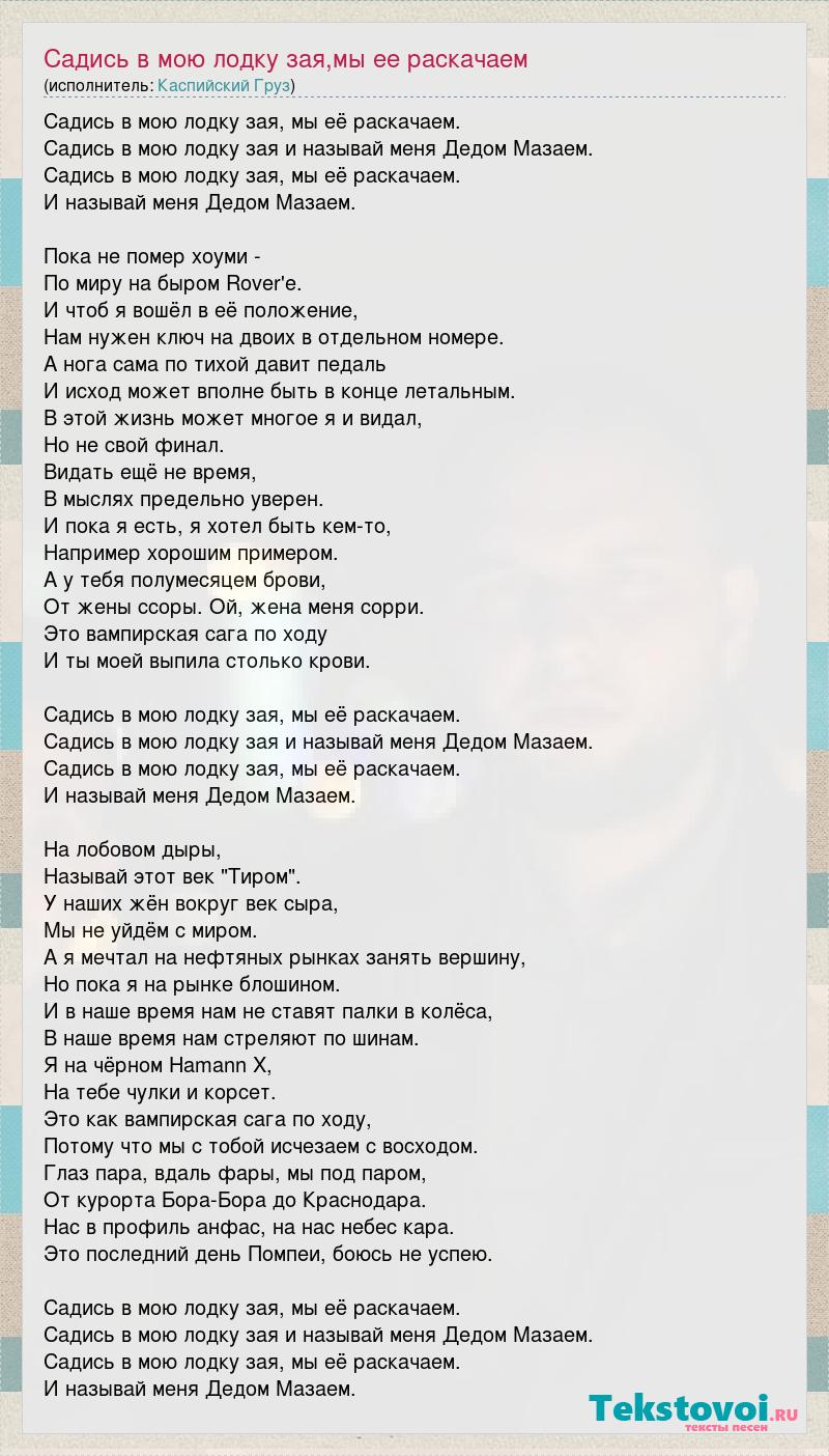 Садись в мою лодку зая, мы её раскачаем. Садись в мою лодку зая и называй меня Дедом Мазаем. Садись в мою лодку зая, мы её раскачаем. И называй меня Дедом Мазаем. Пока не помер хоуми - По миру на быром Rover'e. И чтоб я вошёл в её положение, Нам нужен ключ на двоих в отдельном номере. А нога сама по тихой давит педаль И исход может вполне быть в конце летальным. В этой жизнь может многое я и видал, Но не свой финал. Видать ещё не время, В мыслях предельно уверен. И пока я есть, я хотел быть кем-то, Например хорошим примером. А у тебя полумесяцем брови, От жены ссоры. Ой, жена меня сорри. Это вампирская сага по ходу И ты моей выпила столько крови. Садись в мою лодку зая, мы её раскачаем. Садись в мою лодку зая и называй меня Дедом Мазаем. Садись в мою лодку зая, мы её раскачаем. И называй меня Дедом Мазаем. На лобовом дыры, Называй этот век "Тиром". У наших жён вокруг век сыра, Мы не уйдём с миром. А я мечтал на нефтяных рынках занять вершину, Но пока я на рынке блошином. И в наше время нам не ставят палки в колёса, В наше время нам стреляют по шинам. Я на чёрном Hamann X, На тебе чулки и корсет. Это как вампирская сага по ходу, Потому что мы с тобой исчезаем с восходом. Глаз пара, вдаль фары, мы под паром, От курорта Бора-Бора до Краснодара. Нас в профиль анфас, на нас небес кара. Это последний день Помпеи, боюсь не успею. Садись в мою лодку зая, мы её раскачаем. Садись в мою лодку зая и называй меня Дедом Мазаем. Садись в мою лодку зая, мы её раскачаем. И называй меня Дедом Мазаем.