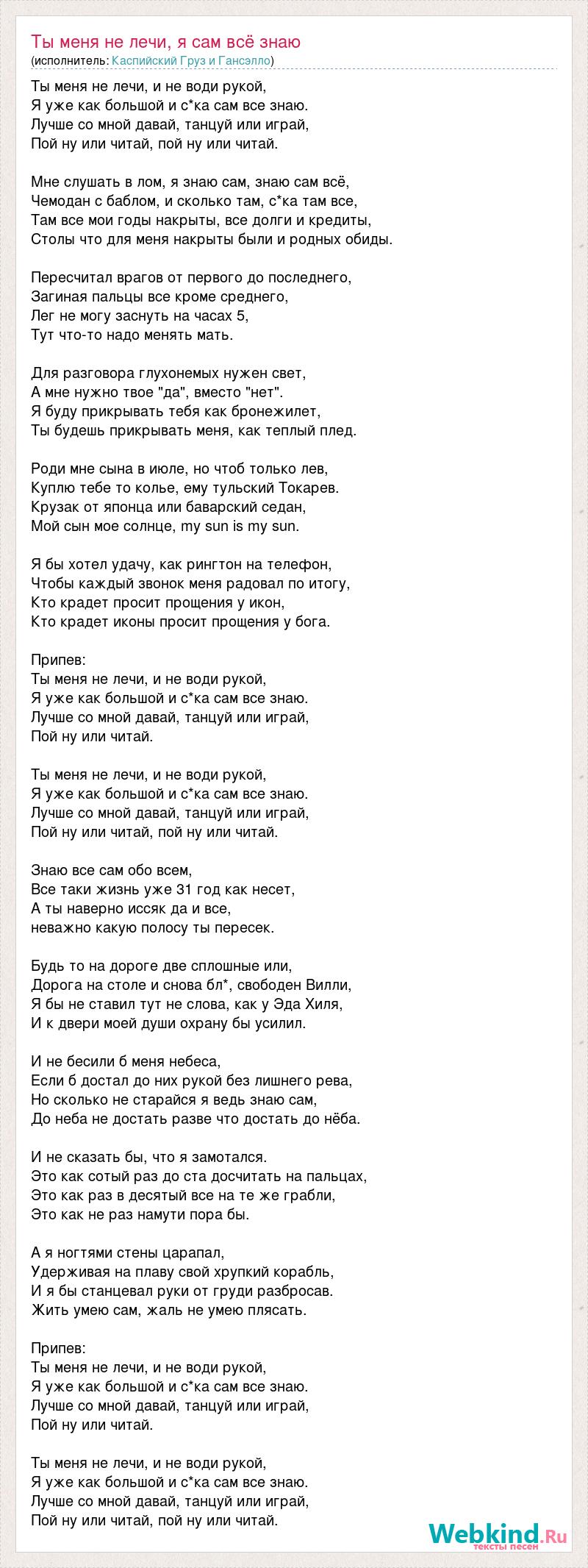 Ты меня не лечи, и не води рукой, Я уже как большой и с*ка сам все знаю. Лучше со мной давай, танцуй или играй, Пой ну или читай, пой ну или читай. Мне слушать в лом, я знаю сам, знаю сам всё, Чемодан с баблом, и сколько там, с*ка там все, Там все мои годы накрыты, все долги и кредиты, Столы что для меня накрыты были и родных обиды. Пересчитал врагов от первого до последнего, Загиная пальцы все кроме среднего, Лег не могу заснуть на часах 5, Тут что-то надо менять мать. Для разговора глухонемых нужен свет, А мне нужно твое "да", вместо "нет". Я буду прикрывать тебя как бронежилет, Ты будешь прикрывать меня, как теплый плед. Роди мне сына в июле, но чтоб только лев, Куплю тебе то колье, ему тульский Токарев. Крузак от японца или баварский седан, Мой сын мое солнце, my sun is my sun. Я бы хотел удачу, как рингтон на телефон, Чтобы каждый звонок меня радовал по итогу, Кто крадет просит прощения у икон, Кто крадет иконы просит прощения у бога. Припев: Ты меня не лечи, и не води рукой, Я уже как большой и с*ка сам все знаю. Лучше со мной давай, танцуй или играй, Пой ну или читай. Ты меня не лечи, и не води рукой, Я уже как большой и с*ка сам все знаю. Лучше со мной давай, танцуй или играй, Пой ну или читай, пой ну или читай. Знаю все сам обо всем, Все таки жизнь уже 31 год как несет, А ты наверно иссяк да и все, неважно какую полосу ты пересек. Будь то на дороге две сплошные или, Дорога на столе и снова бл*, свободен Вилли, Я бы не ставил тут не слова, как у Эда Хиля, И к двери моей души охрану бы усилил. И не бесили б меня небеса, Если б достал до них рукой без лишнего рева, Но сколько не старайся я ведь знаю сам, До неба не достать разве что достать до нёба. И не сказать бы, что я замотался. Это как сотый раз до ста досчитать на пальцах, Это как раз в десятый все на те же грабли, Это как не раз намути пора бы. А я ногтями стены царапал, Удерживая на плаву свой хрупкий корабль, И я бы станцевал руки от груди разбросав. Жить умею сам, жаль не умею плясать. Припев: Ты меня не лечи, и не води рукой, Я уже как большой и с*ка сам все знаю. Лучше со мной давай, танцуй или играй, Пой ну или читай. Ты меня не лечи, и не води рукой, Я уже как большой и с*ка сам все знаю. Лучше со мной давай, танцуй или играй, Пой ну или читай, пой ну или читай.