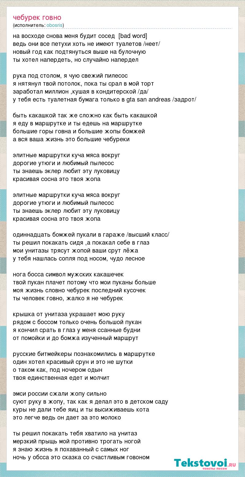 на восходе снова меня будит сосед [bad word] ведь они все петухи хоть не имеют туалетов /неет/ новый год как подтянуться выше на булочную ты хотел напердеть, но случайно напердел рука под столом, я чую свежий пилесос я нятянул твой потолок, пока ты срал в мой торт заработал миллион ,кушая в кондитерской /да/ у тебя есть туалетная бумага только в gta san andreas /задрот/ быть какашкой так же сложно как быть какашкой я еду в маршрутке и ты едешь на маршрутке большие горы говна и большие жопы бомжей а вся ваша жизнь это большие чебуреки элитные маршрутки куча мяса вокруг дорогие утюги и любимый пылесос ты знаешь эклер любит эту луковицу красивая сосна это твоя жопа элитные маршрутки куча мяса вокруг дорогие утюги и любимый пылесос ты знаешь эклер любит эту луковицу красивая сосна это твоя жопа одиннадцать бомжей пукали в гараже /высший класс/ ты решил покакать сидя ,а покакал себе в глаз мои унитазы трясут жопой ваши срут лёжа у тебя нашлась сопля под носом, чудо лесное нога босса символ мужских какашечек твой пукан плачет потому что мои пуканы больше моя жизнь словно чебурек последний кусочек ты человек говно, жалко я не чебурек крышка от унитаза украшает мою руку рядом с боссом только очень большой пукан я кончил срать в глаз у меня ссанные будни от помойки и до бомжа изученный маршрут русские битмейкеры познакомились в маршрутке один хотел красивый срун и это не шутки о таком как, под ночером одын твоя единственная едет и молчит эмси россии сжали жопу сильно суют руку в жопу, так как я делал это в детском саду куры не дали тебе яиц и ты высиживаешь кота это легче ведь он дает за это молоко ты решил покакать тебя хватило на унитаз мерзкий прыщь мой противно трогать ногой я знаю жизнь я похаванный с самых ног ночь у обсса это сказка со счастливым говоном