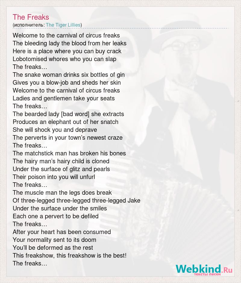 Welcome to the carnival of circus freaks The bleeding lady the blood from her leaks Here is a place where you can buy crack Lobotomised whores who you can slap The freaks… The snake woman drinks six bottles of gin Gives you a blow-job and sheds her skin Welcome to the carnival of circus freaks Ladies and gentlemen take your seats The freaks… The bearded lady [bad word] she extracts Produces an elephant out of her snatch She will shock you and deprave The perverts in your town’s newest craze The freaks… The matchstick man has broken his bones The hairy man’s hairy child is cloned Under the surface of glitz and pearls Their poison into you will unfurl The freaks… The muscle man the legs does break Of three-legged three-legged three-legged Jake Under the surface under the smiles Each one a pervert to be defiled The freaks… After your heart has been consumed Your normality sent to its doom You’ll be deformed as the rest This freakshow, this freakshow is the best! The freaks…