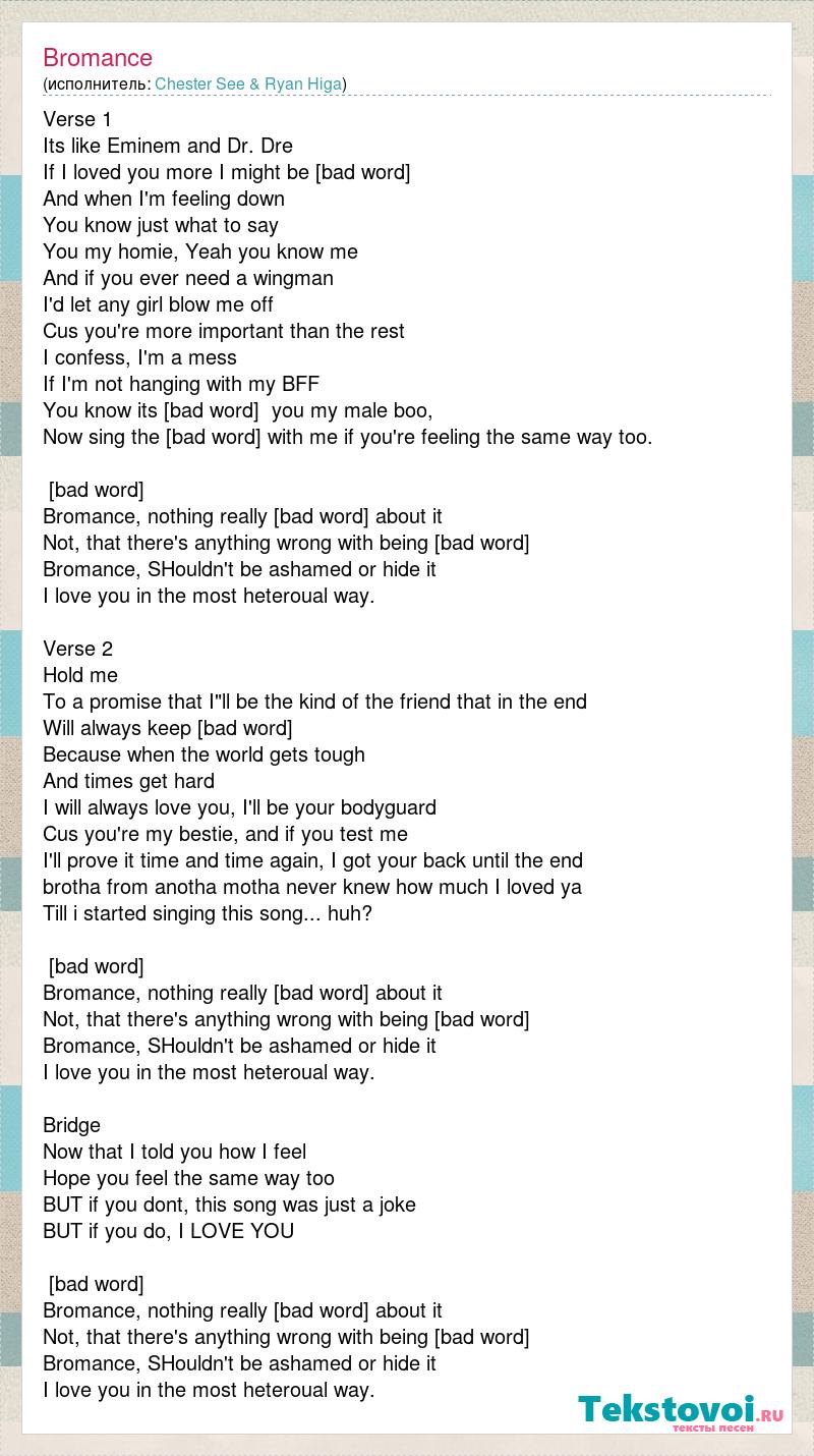 Verse 1 Its like Eminem and Dr. Dre If I loved you more I might be [bad word] And when I'm feeling down You know just what to say You my homie, Yeah you know me And if you ever need a wingman I'd let any girl blow me off Cus you're more important than the rest I confess, I'm a mess If I'm not hanging with my BFF You know its [bad word] you my male boo, Now sing the [bad word] with me if you're feeling the same way too. [bad word] Bromance, nothing really [bad word] about it Not, that there's anything wrong with being [bad word] Bromance, SHouldn't be ashamed or hide it I love you in the most heteroual way. Verse 2 Hold me To a promise that I"ll be the kind of the friend that in the end Will always keep [bad word] Because when the world gets tough And times get hard I will always love you, I'll be your bodyguard Cus you're my bestie, and if you test me I'll prove it time and time again, I got your back until the end brotha from anotha motha never knew how much I loved ya Till i started singing this song... huh? [bad word] Bromance, nothing really [bad word] about it Not, that there's anything wrong with being [bad word] Bromance, SHouldn't be ashamed or hide it I love you in the most heteroual way. Bridge Now that I told you how I feel Hope you feel the same way too BUT if you dont, this song was just a joke BUT if you do, I LOVE YOU [bad word] Bromance, nothing really [bad word] about it Not, that there's anything wrong with being [bad word] Bromance, SHouldn't be ashamed or hide it I love you in the most heteroual way.