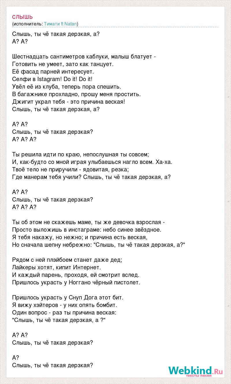Слышь, ты чё такая дерзкая, а? А? А? Шестнадцать сантиметров каблуки, малыш блатует - Готовить не умеет, зато как танцует. Её фасад парней интересует. Селфи в Istagram! Do it! Do it! Увёл её из клуба, теперь пора спешить. В багажнике прохладно, прошу меня простить. Джигит украл тебя - это причина веская! Слышь, ты чё такая дерзкая, а? А? А? Слышь, ты чё такая дерзкая? А? А? А? Ты решила идти по краю, непослушная ты совсем; И, как-будто со мной играя улыбаешься нагло всем. Ха-ха. Твоё тело не приручили - ядовитая, резка; Где манерам тебя учили? Слышь, ты чё такая дерзкая, а? А? А? Слышь, ты чё такая дерзкая? А? А? А? Ты об этом не скажешь маме, ты же девочка взрослая - Просто выложишь в инстаграме: небо синее звёздное. Я тебя накажу, но нежно; и причина есть веская, Но сначала шепну небрежно: "Слышь, ты чё такая дерзкая, а?" Рядом с ней плэйбоем станет даже дед; Лайкеры хотят, кипит Интернет. И каждый парень, проходя, ей смотрит вслед. Пришлось украсть у Ноггано чёрный пистолет. Пришлось украсть у Снуп Дога этот бит. Я вижу хэйтеров - у них опять бомбит. Один вопрос - раз ты причина веская: "Слышь, ты чё такая дерзкая, а ?" А? А? Слышь, ты чё такая дерзкая? А? Слышь, ты чё такая дерзкая?