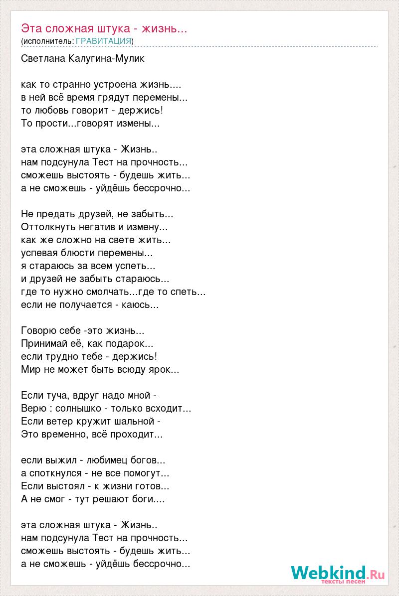 Светлана Калугина-Мулик как то странно устроена жизнь.... в ней всё время грядут перемены... то любовь говорит - держись! То прости...говорят измены... эта сложная штука - Жизнь.. нам подсунула Тест на прочность... сможешь выстоять - будешь жить... а не сможешь - уйдёшь бессрочно... Не предать друзей, не забыть... Оттолкнуть негатив и измену... как же сложно на свете жить... успевая блюсти перемены... я стараюсь за всем успеть... и друзей не забыть стараюсь... где то нужно смолчать...где то спеть... если не получается - каюсь... Говорю себе -это жизнь... Принимай её, как подарок... если трудно тебе - держись! Мир не может быть всюду ярок... Если туча, вдруг надо мной - Верю : солнышко - только всходит... Если ветер кружит шальной - Это временно, всё проходит... если выжил - любимец богов... а споткнулся - не все помогут... Если выстоял - к жизни готов... А не смог - тут решают боги.... эта сложная штука - Жизнь.. нам подсунула Тест на прочность... сможешь выстоять - будешь жить... а не сможешь - уйдёшь бессрочно...