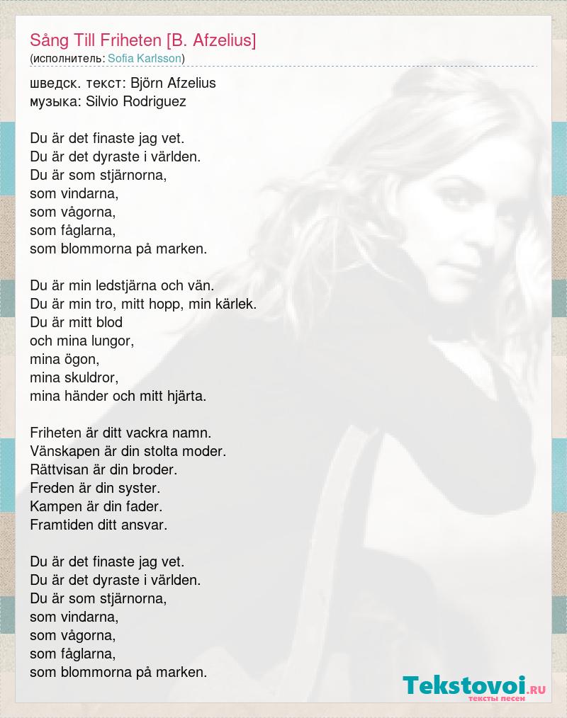 шведск. текст: Björn Afzelius музыка: Silvio Rodriguez Du är det finaste jag vet. Du är det dyraste i världen. Du är som stjärnorna, som vindarna, som vågorna, som fåglarna, som blommorna på marken. Du är min ledstjärna och vän. Du är min tro, mitt hopp, min kärlek. Du är mitt blod och mina lungor, mina ögon, mina skuldror, mina händer och mitt hjärta. Friheten är ditt vackra namn. Vänskapen är din stolta moder. Rättvisan är din broder. Freden är din syster. Kampen är din fader. Framtiden ditt ansvar. Du är det finaste jag vet. Du är det dyraste i världen. Du är som stjärnorna, som vindarna, som vågorna, som fåglarna, som blommorna på marken.