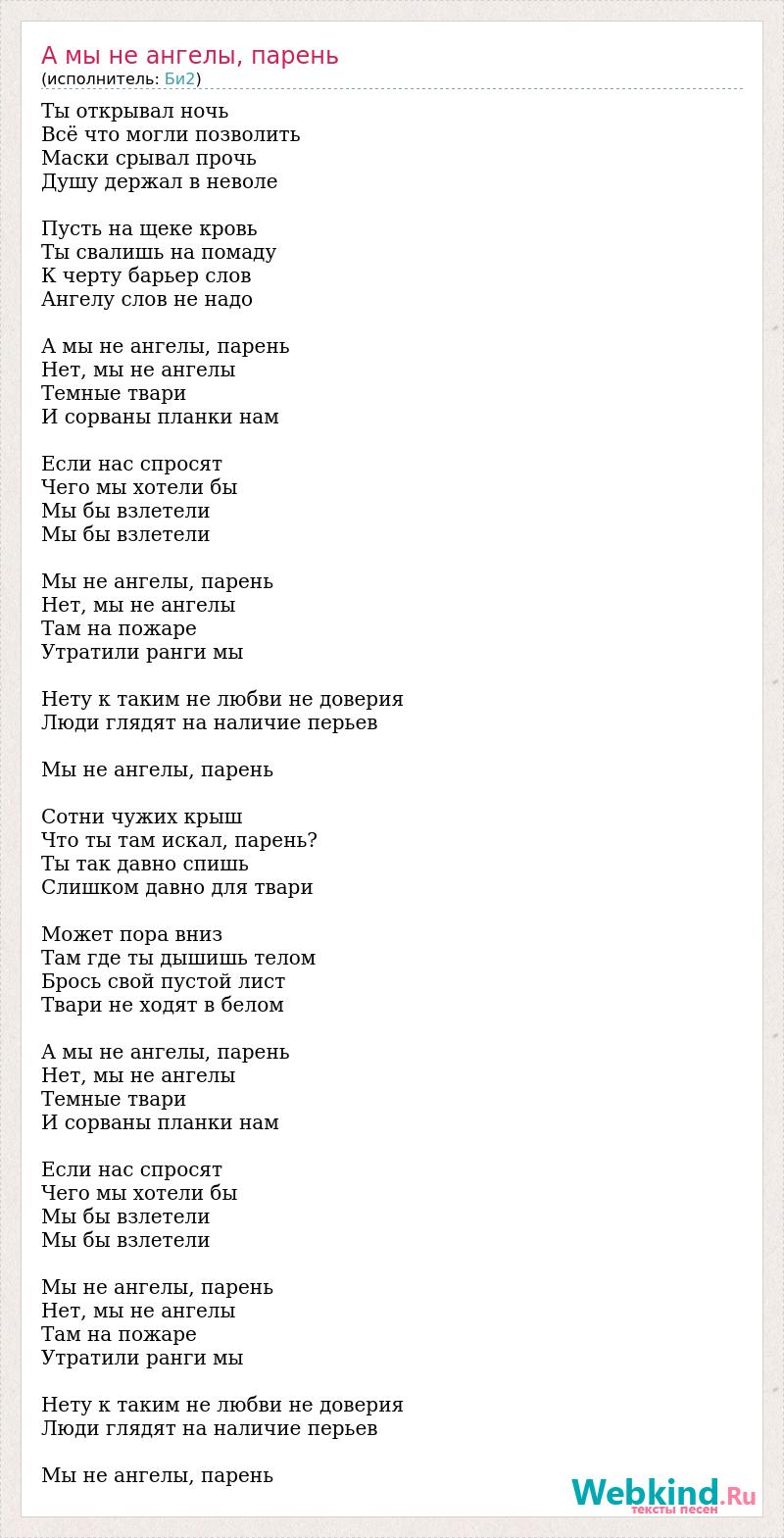 Ты открывал ночь Всё что могли позволить Маски срывал прочь Душу держал в неволе Пусть на щеке кровь Ты свалишь на помаду К черту барьер слов Ангелу слов не надо А мы не ангелы, парень Нет, мы не ангелы Темные твари И сорваны планки нам Если нас спросят Чего мы хотели бы Мы бы взлетели Мы бы взлетели Мы не ангелы, парень Нет, мы не ангелы Там на пожаре Утратили ранги мы Нету к таким не любви не доверия Люди глядят на наличие перьев Мы не ангелы, парень Сотни чужих крыш Что ты там искал, парень? Ты так давно спишь Слишком давно для твари Может пора вниз Там где ты дышишь телом Брось свой пустой лист Твари не ходят в белом А мы не ангелы, парень Нет, мы не ангелы Темные твари И сорваны планки нам Если нас спросят Чего мы хотели бы Мы бы взлетели Мы бы взлетели Мы не ангелы, парень Нет, мы не ангелы Там на пожаре Утратили ранги мы Нету к таким не любви не доверия Люди глядят на наличие перьев Мы не ангелы, парень