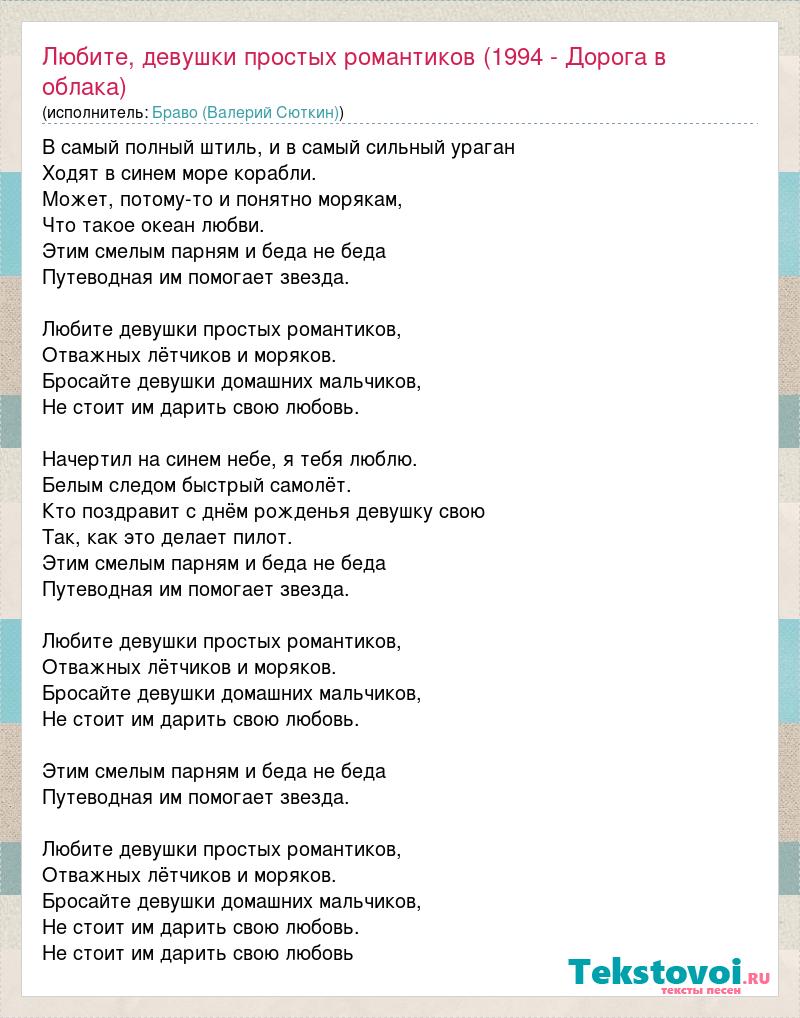 В самый полный штиль, и в самый сильный ураган Ходят в синем море корабли. Может, потому-то и понятно морякам, Что такое океан любви. Этим смелым парням и беда не беда Путеводная им помогает звезда. Любите девушки простых романтиков, Отважных лётчиков и моряков. Бросайте девушки домашних мальчиков, Не стоит им дарить свою любовь. Начертил на синем небе, я тебя люблю. Белым следом быстрый самолёт. Кто поздравит с днём рожденья девушку свою Так, как это делает пилот. Этим смелым парням и беда не беда Путеводная им помогает звезда. Любите девушки простых романтиков, Отважных лётчиков и моряков. Бросайте девушки домашних мальчиков, Не стоит им дарить свою любовь. Этим смелым парням и беда не беда Путеводная им помогает звезда. Любите девушки простых романтиков, Отважных лётчиков и моряков. Бросайте девушки домашних мальчиков, Не стоит им дарить свою любовь. Не стоит им дарить свою любовь