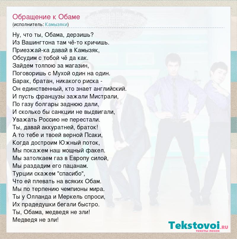 Ну, что ты, Обама, дерзишь? Из Вашингтона там чё-то кричишь. Приезжай-ка давай в Камызяк, Обсудим с тобой чё да как. Зайдем толпою за магазин, Поговоришь с Мухой один на один. Барак, братан, никакого риска - Он единственный, кто знает английский. И пусть французы зажали Мистрали, По газу болгары заднюю дали, И сколько бы санкции не выдвигали, Уважать Россию не перестали. Ты, давай аккуратней, браток! А то тебе и твоей верной Псаки, Когда достроим Южный поток, Мы покажем наш мощный факел. Мы затолкаем газ в Европу силой, Мы раздадим его пацанам. Турции скажем "спасибо", Что ей плевать на всяких Обам. Мы по терпению чемпионы мира. Ты у Олланда и Меркель спроси, Их прадедушки бегали быстро. Ты, Обама, медведя не зли! Медведя не зли!