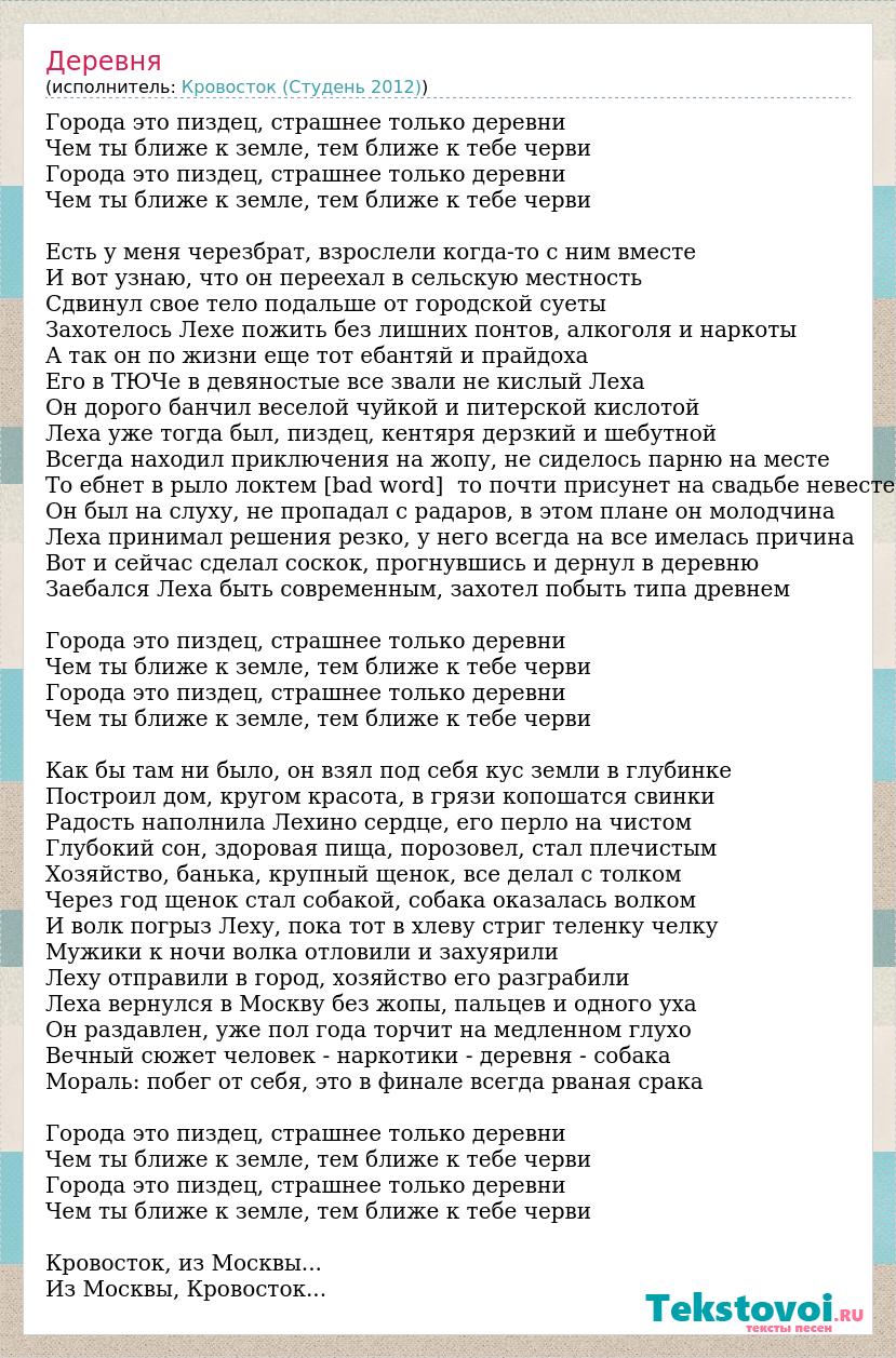 Города это пиздец, страшнее только деревни Чем ты ближе к земле, тем ближе к тебе черви Города это пиздец, страшнее только деревни Чем ты ближе к земле, тем ближе к тебе черви Есть у меня черезбрат, взрослели когда-то с ним вместе И вот узнаю, что он переехал в сельскую местность Сдвинул свое тело подальше от городской суеты Захотелось Лехе пожить без лишних понтов, алкоголя и наркоты А так он по жизни еще тот ебантяй и прайдоха Его в ТЮЧе в девяностые все звали не кислый Леха Он дорого банчил веселой чуйкой и питерской кислотой Леха уже тогда был, пиздец, кентяря дерзкий и шебутной Всегда находил приключения на жопу, не сиделось парню на месте То ебнет в рыло локтем [bad word] то почти присунет на свадьбе невесте Он был на слуху, не пропадал с радаров, в этом плане он молодчина Леха принимал решения резко, у него всегда на все имелась причина Вот и сейчас сделал соскок, прогнувшись и дернул в деревню Заебался Леха быть современным, захотел побыть типа древнем Города это пиздец, страшнее только деревни Чем ты ближе к земле, тем ближе к тебе черви Города это пиздец, страшнее только деревни Чем ты ближе к земле, тем ближе к тебе черви Как бы там ни было, он взял под себя кус земли в глубинке Построил дом, кругом красота, в грязи копошатся свинки Радость наполнила Лехино сердце, его перло на чистом Глубокий сон, здоровая пища, порозовел, стал плечистым Хозяйство, банька, крупный щенок, все делал с толком Через год щенок стал собакой, собака оказалась волком И волк погрыз Леху, пока тот в хлеву стриг теленку челку Мужики к ночи волка отловили и захуярили Леху отправили в город, хозяйство его разграбили Леха вернулся в Москву без жопы, пальцев и одного уха Он раздавлен, уже пол года торчит на медленном глухо Вечный сюжет человек - наркотики - деревня - собака Мораль: побег от себя, это в финале всегда рваная срака Города это пиздец, страшнее только деревни Чем ты ближе к земле, тем ближе к тебе черви Города это пиздец, страшнее только деревни Чем ты ближе к земле, тем ближе к тебе черви Кровосток, из Москвы... Из Москвы, Кровосток...