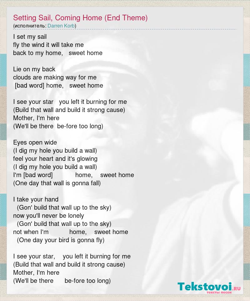I set my sail fly the wind it will take me back to my home, sweet home Lie on my back clouds are making way for me [bad word] home, sweet home I see your star you left it burning for me (Build that wall and build it strong cause) Mother, I'm here (We'll be there be-fore too long) Eyes open wide (I dig my hole you build a wall) feel your heart and it's glowing (I dig my hole you build a wall) I'm [bad word] home, sweet home (One day that wall is gonna fall) I take your hand (Gon' build that wall up to the sky) now you'll never be lonely (Gon' build that wall up to the sky) not when I'm home, sweet home (One day your bird is gonna fly) I see your star, you left it burning for me (Build that wall and build it strong cause) Mother, I'm here (We'll be there be-fore too long)