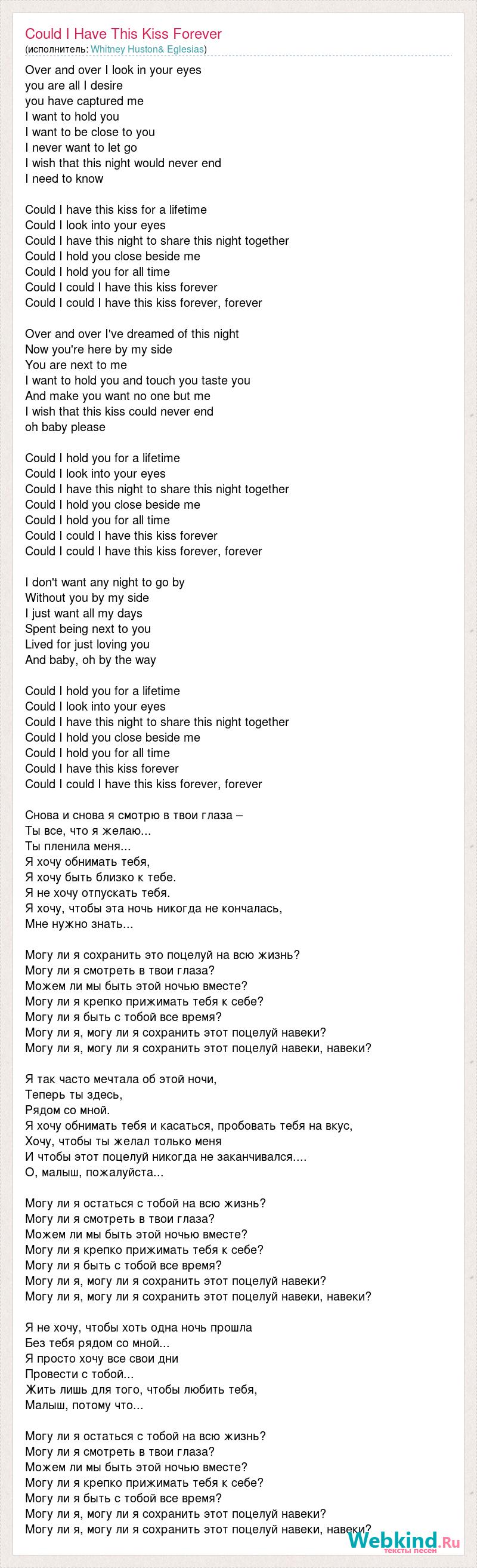 Over and over I look in your eyes you are all I desire you have captured me I want to hold you I want to be close to you I never want to let go I wish that this night would never end I need to know Could I have this kiss for a lifetime Could I look into your eyes Could I have this night to share this night together Could I hold you close beside me Could I hold you for all time Could I could I have this kiss forever Could I could I have this kiss forever, forever Over and over I've dreamed of this night Now you're here by my side You are next to me I want to hold you and touch you taste you And make you want no one but me I wish that this kiss could never end oh baby please Could I hold you for a lifetime Could I look into your eyes Could I have this night to share this night together Could I hold you close beside me Could I hold you for all time Could I could I have this kiss forever Could I could I have this kiss forever, forever I don't want any night to go by Without you by my side I just want all my days Spent being next to you Lived for just loving you And baby, oh by the way Could I hold you for a lifetime Could I look into your eyes Could I have this night to share this night together Could I hold you close beside me Could I hold you for all time Could I have this kiss forever Could I could I have this kiss forever, forever Снова и снова я смотрю в твои глаза – Ты все, что я желаю... Ты пленила меня... Я хочу обнимать тебя, Я хочу быть близко к тебе. Я не хочу отпускать тебя. Я хочу, чтобы эта ночь никогда не кончалась, Мне нужно знать... Могу ли я сохранить это поцелуй на всю жизнь? Могу ли я смотреть в твои глаза? Можем ли мы быть этой ночью вместе? Могу ли я крепко прижимать тебя к себе? Могу ли я быть с тобой все время? Могу ли я, могу ли я сохранить этот поцелуй навеки? Могу ли я, могу ли я сохранить этот поцелуй навеки, навеки? Я так часто мечтала об этой ночи, Теперь ты здесь, Рядом со мной. Я хочу обнимать тебя и касаться, пробовать тебя на вкус, Хочу, чтобы ты желал только меня И чтобы этот поцелуй никогда не заканчивался.... О, малыш, пожалуйста... Могу ли я остаться с тобой на всю жизнь? Могу ли я смотреть в твои глаза? Можем ли мы быть этой ночью вместе? Могу ли я крепко прижимать тебя к себе? Могу ли я быть с тобой все время? Могу ли я, могу ли я сохранить этот поцелуй навеки? Могу ли я, могу ли я сохранить этот поцелуй навеки, навеки? Я не хочу, чтобы хоть одна ночь прошла Без тебя рядом со мной... Я просто хочу все свои дни Провести с тобой... Жить лишь для того, чтобы любить тебя, Малыш, потому что... Могу ли я остаться с тобой на всю жизнь? Могу ли я смотреть в твои глаза? Можем ли мы быть этой ночью вместе? Могу ли я крепко прижимать тебя к себе? Могу ли я быть с тобой все время? Могу ли я, могу ли я сохранить этот поцелуй навеки? Могу ли я, могу ли я сохранить этот поцелуй навеки, навеки?