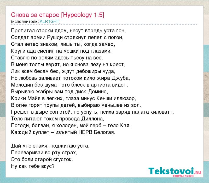 Пропитал строки ядом, несут впредь уста гон, Солдат армии Рушди стряхнул пепел с погон, Стал ветер знаком, лишь ты, когда замер, Круги ада сменил на мешки под глазами. Ставлю по ролям здесь пьесу на вес, В меня толпы верят, но я снова лезу на крест, Лик всем бесам бес, ждут дебоширы чуда, Но любовь заливает потоком кило жира Джуба, Мелодин без шума - это блеск в артиста видон, Вырываю жабры вам под диск Домино, Крики Майя в легких, глаза минус Кенши иллюзор, В огне горят трупы детей, выбираю меньшее из зол. Грешен в дыре сон этой, не уснуть, психа заряд палата киловатт, Тело питают током провода Диллона, Погоди, болван, я холоден, мой герб – тело Кая, Каждый куплет – изъятый НЕРВ Белогая. Дай мне знамя, поджигаю уста, Переваривай во рту страх, Это боли старой сгусток. Ну как тебе вкус?