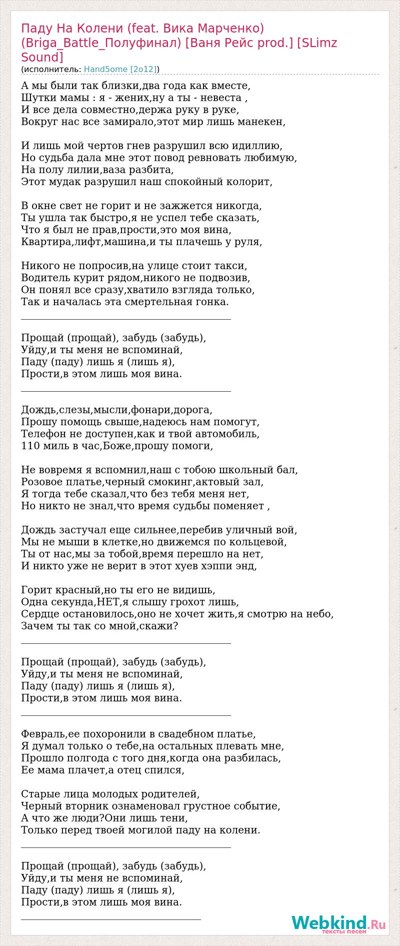 А мы были так близки,два года как вместе, Шутки мамы : я - жених,ну а ты - невеста , И все дела совместно,держа руку в руке, Вокруг нас все замирало,этот мир лишь манекен, И лишь мой чертов гнев разрушил всю идиллию, Но судьба дала мне этот повод ревновать любимую, На полу лилии,ваза разбита, Этот мудак разрушил наш спокойный колорит, В окне свет не горит и не зажжется никогда, Ты ушла так быстро,я не успел тебе сказать, Что я был не прав,прости,это моя вина, Квартира,лифт,машина,и ты плачешь у руля, Никого не попросив,на улице стоит такси, Водитель курит рядом,никого не подвозив, Он понял все сразу,хватило взгляда только, Так и началась эта смертельная гонка. __________________________________________ Прощай (прощай), забудь (забудь), Уйду,и ты меня не вспоминай, Паду (паду) лишь я (лишь я), Прости,в этом лишь моя вина. __________________________________________ Дождь,слезы,мысли,фонари,дорога, Прошу помощь свыше,надеюсь нам помогут, Телефон не доступен,как и твой автомобиль, 110 миль в час,Боже,прошу помоги, Не вовремя я вспомнил,наш с тобою школьный бал, Розовое платье,черный смокинг,актовый зал, Я тогда тебе сказал,что без тебя меня нет, Но никто не знал,что время судьбы поменяет , Дождь застучал еще сильнее,перебив уличный вой, Мы не мыши в клетке,но движемся по кольцевой, Ты от нас,мы за тобой,время перешло на нет, И никто уже не верит в этот хуев хэппи энд, Горит красный,но ты его не видишь, Одна секунда,НЕТ,я слышу грохот лишь, Сердце остановилось,оно не хочет жить,я смотрю на небо, Зачем ты так со мной,скажи? __________________________________________ Прощай (прощай), забудь (забудь), Уйду,и ты меня не вспоминай, Паду (паду) лишь я (лишь я), Прости,в этом лишь моя вина. __________________________________________ Февраль,ее похоронили в свадебном платье, Я думал только о тебе,на остальных плевать мне, Прошло полгода с того дня,когда она разбилась, Ее мама плачет,а отец спился, Старые лица молодых родителей, Черный вторник ознаменовал грустное событие, А что же люди?Они лишь тени, Только перед твоей могилой паду на колени. __________________________________________ Прощай (прощай), забудь (забудь), Уйду,и ты меня не вспоминай, Паду (паду) лишь я (лишь я), Прости,в этом лишь моя вина. ____________________________________