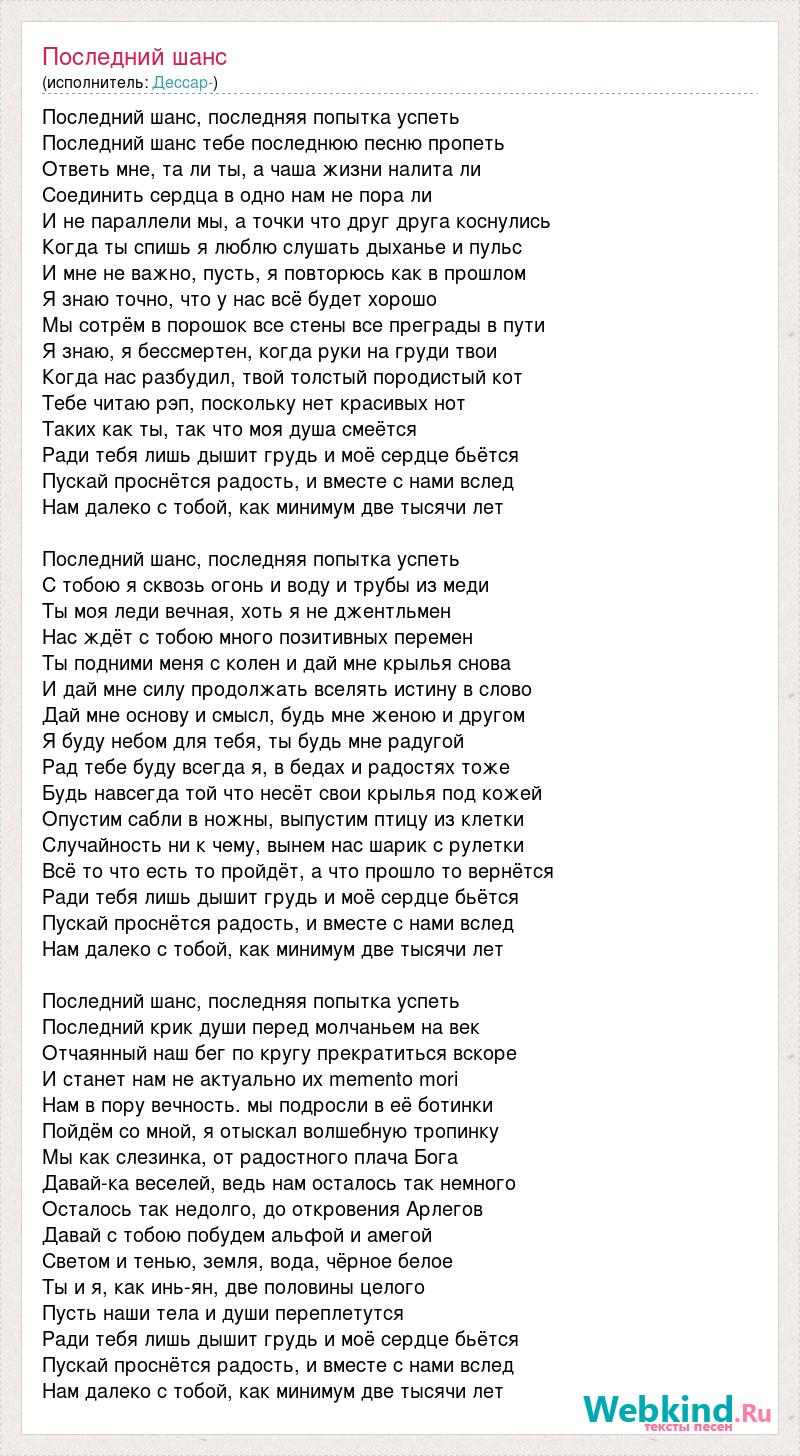 Последний шанс, последняя попытка успеть Последний шанс тебе последнюю песню пропеть Ответь мне, та ли ты, а чаша жизни налита ли Соединить сердца в одно нам не пора ли И не параллели мы, а точки что друг друга коснулись Когда ты спишь я люблю слушать дыханье и пульс И мне не важно, пусть, я повторюсь как в прошлом Я знаю точно, что у нас всё будет хорошо Мы сотрём в порошок все стены все преграды в пути Я знаю, я бессмертен, когда руки на груди твои Когда нас разбудил, твой толстый породистый кот Тебе читаю рэп, поскольку нет красивых нот Таких как ты, так что моя душа смеётся Ради тебя лишь дышит грудь и моё сердце бьётся Пускай проснётся радость, и вместе с нами вслед Нам далеко с тобой, как минимум две тысячи лет Последний шанс, последняя попытка успеть С тобою я сквозь огонь и воду и трубы из меди Ты моя леди вечная, хоть я не джентльмен Нас ждёт с тобою много позитивных перемен Ты подними меня с колен и дай мне крылья снова И дай мне силу продолжать вселять истину в слово Дай мне основу и смысл, будь мне женою и другом Я буду небом для тебя, ты будь мне радугой Рад тебе буду всегда я, в бедах и радостях тоже Будь навсегда той что несёт свои крылья под кожей Опустим сабли в ножны, выпустим птицу из клетки Случайность ни к чему, вынем нас шарик с рулетки Всё то что есть то пройдёт, а что прошло то вернётся Ради тебя лишь дышит грудь и моё сердце бьётся Пускай проснётся радость, и вместе с нами вслед Нам далеко с тобой, как минимум две тысячи лет Последний шанс, последняя попытка успеть Последний крик души перед молчаньем на век Отчаянный наш бег по кругу прекратиться вскоре И станет нам не актуально их memento mori Нам в пору вечность. мы подросли в её ботинки Пойдём со мной, я отыскал волшебную тропинку Мы как слезинка, от радостного плача Бога Давай-ка веселей, ведь нам осталось так немного Осталось так недолго, до откровения Арлегов Давай с тобою побудем альфой и амегой Светом и тенью, земля, вода, чёрное белое Ты и я, как инь-ян, две половины целого Пусть наши тела и души переплетутся Ради тебя лишь дышит грудь и моё сердце бьётся Пускай проснётся радость, и вместе с нами вслед Нам далеко с тобой, как минимум две тысячи лет