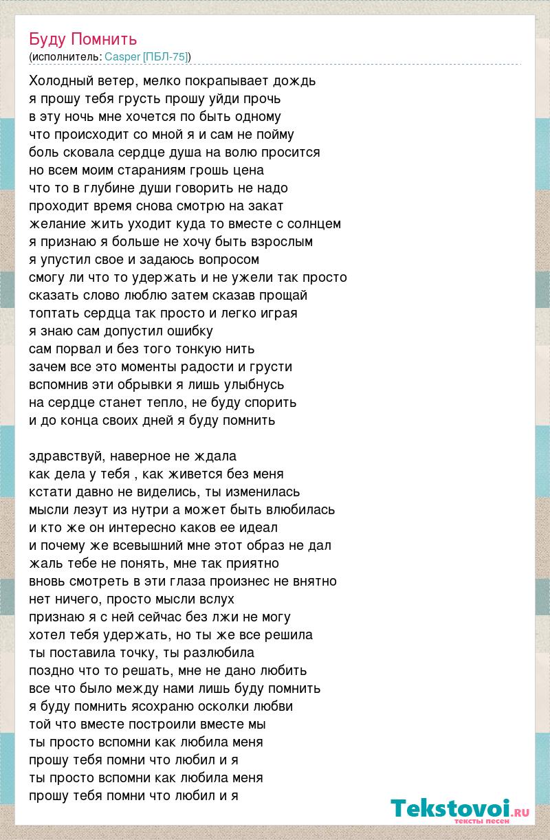 Холодный ветер, мелко покрапывает дождь я прошу тебя грусть прошу уйди прочь в эту ночь мне хочется по быть одному что происходит со мной я и сам не пойму боль сковала сердце душа на волю просится но всем моим стараниям грошь цена что то в глубине души говорить не надо проходит время снова смотрю на закат желание жить уходит куда то вместе с солнцем я признаю я больше не хочу быть взрослым я упустил свое и задаюсь вопросом смогу ли что то удержать и не ужели так просто сказать слово люблю затем сказав прощай топтать сердца так просто и легко играя я знаю сам допустил ошибку сам порвал и без того тонкую нить зачем все это моменты радости и грусти вспомнив эти обрывки я лишь улыбнусь на сердце станет тепло, не буду спорить и до конца своих дней я буду помнить здравствуй, наверное не ждала как дела у тебя , как живется без меня кстати давно не виделись, ты изменилась мысли лезут из нутри а может быть влюбилась и кто же он интересно каков ее идеал и почему же всевышний мне этот образ не дал жаль тебе не понять, мне так приятно вновь смотреть в эти глаза произнес не внятно нет ничего, просто мысли вслух признаю я с ней сейчас без лжи не могу хотел тебя удержать, но ты же все решила ты поставила точку, ты разлюбила поздно что то решать, мне не дано любить все что было между нами лишь буду помнить я буду помнить ясохраню осколки любви той что вместе построили вместе мы ты просто вспомни как любила меня прошу тебя помни что любил и я ты просто вспомни как любила меня прошу тебя помни что любил и я