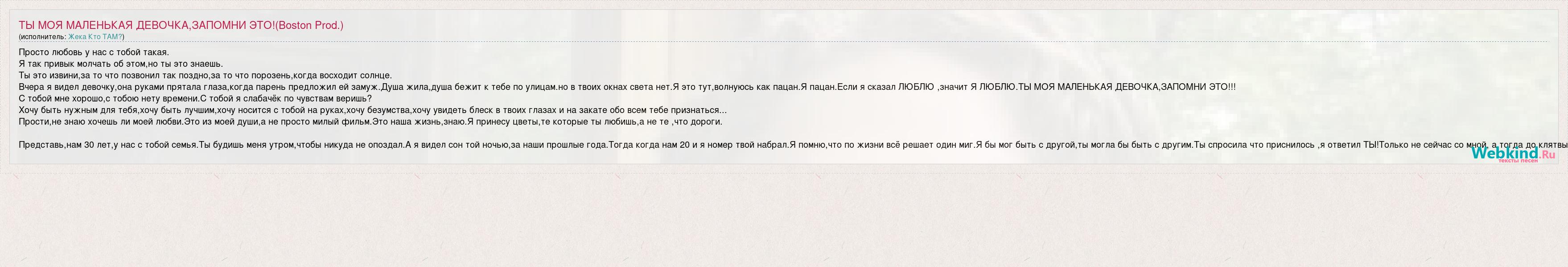 Просто любовь у нас с тобой такая. Я так привык молчать об этом,но ты это знаешь. Ты это извини,за то что позвонил так поздно,за то что порозень,когда восходит солнце. Вчера я видел девочку,она руками прятала глаза,когда парень предложил ей замуж.Душа жила,душа бежит к тебе по улицам.но в твоих окнах света нет.Я это тут,волнуюсь как пацан.Я пацан.Если я сказал ЛЮБЛЮ ,значит Я ЛЮБЛЮ.ТЫ МОЯ МАЛЕНЬКАЯ ДЕВОЧКА,ЗАПОМНИ ЭТО!!! С тобой мне хорошо,с тобою нету времени.С тобой я слабачёк по чувствам веришь? Хочу быть нужным для тебя,хочу быть лучшим,хочу носится с тобой на руках,хочу безумства,хочу увидеть блеск в твоих глазах и на закате обо всем тебе признаться... Прости,не знаю хочешь ли моей любви.Это из моей души,а не просто милый фильм.Это наша жизнь,знаю.Я принесу цветы,те которые ты любишь,а не те ,что дороги. Представь,нам 30 лет,у нас с тобой семья.Ты будишь меня утром,чтобы никуда не опоздал.А я видел сон той ночью,за наши прошлые года.Тогда когда нам 20 и я номер твой набрал.Я помню,что по жизни всё решает один миг.Я бы мог быть с другой,ты могла бы быть с другим.Ты спросила что приснилось ,я ответил ТЫ!Только не сейчас со мной, а тогда до клятвы