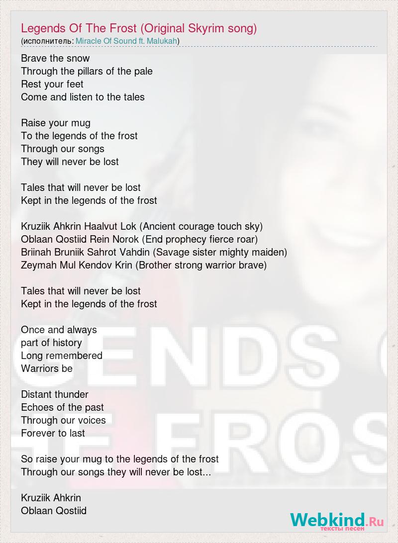 Brave the snow Through the pillars of the pale Rest your feet Come and listen to the tales Raise your mug To the legends of the frost Through our songs They will never be lost Tales that will never be lost Kept in the legends of the frost Kruziik Ahkrin Haalvut Lok (Ancient courage touch sky) Oblaan Qostiid Rein Norok (End prophecy fierce roar) Briinah Bruniik Sahrot Vahdin (Savage sister mighty maiden) Zeymah Mul Kendov Krin (Brother strong warrior brave) Tales that will never be lost Kept in the legends of the frost Once and always part of history Long remembered Warriors be Distant thunder Echoes of the past Through our voices Forever to last So raise your mug to the legends of the frost Through our songs they will never be lost... Kruziik Ahkrin Oblaan Qostiid