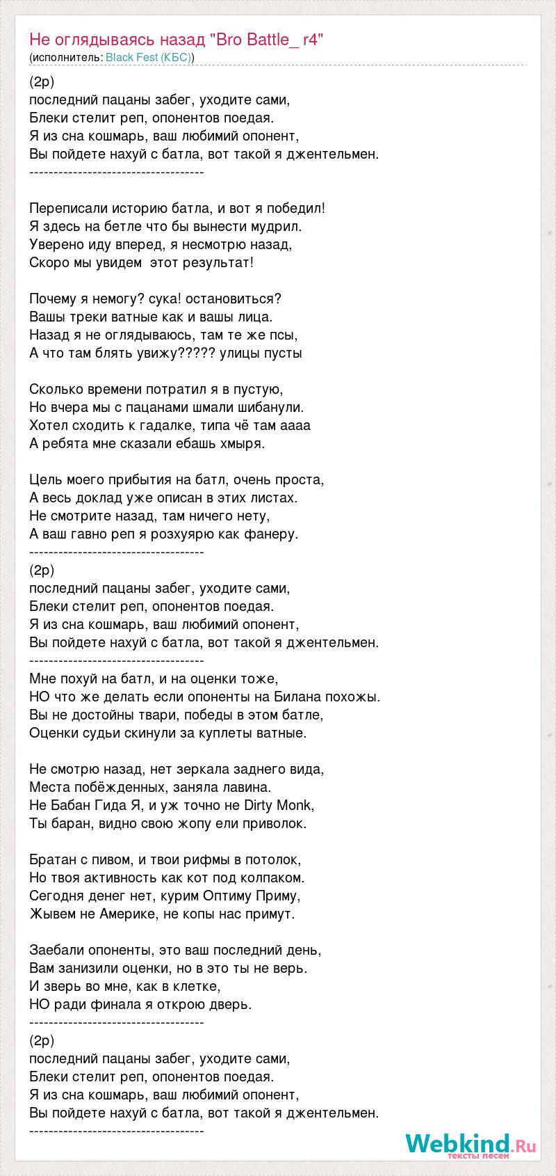 (2р) последний пацаны забег, уходите сами, Блеки стелит реп, опонентов поедая. Я из сна кошмарь, ваш любимий опонент, Вы пойдете нахуй с батла, вот такой я джентельмен. ------------------------------------ Переписали историю батла, и вот я победил! Я здесь на бетле что бы вынести мудрил. Уверено иду вперед, я несмотрю назад, Скоро мы увидем этот результат! Почему я немогу? сука! остановиться? Вашы треки ватные как и вашы лица. Назад я не оглядываюсь, там те же псы, А что там блять увижу????? улицы пусты Сколько времени потратил я в пустую, Но вчера мы с пацанами шмали шибанули. Хотел сходить к гадалке, типа чё там аааа А ребята мне сказали ебашь хмыря. Цель моего прибытия на батл, очень проста, А весь доклад уже описан в этих листах. Не смотрите назад, там ничего нету, А ваш гавно реп я розхуярю как фанеру. ------------------------------------ (2р) последний пацаны забег, уходите сами, Блеки стелит реп, опонентов поедая. Я из сна кошмарь, ваш любимий опонент, Вы пойдете нахуй с батла, вот такой я джентельмен. ------------------------------------ Мне похуй на батл, и на оценки тоже, НО что же делать если опоненты на Билана похожы. Вы не достойны твари, победы в этом батле, Оценки судьи скинули за куплеты ватные. Не смотрю назад, нет зеркала заднего вида, Места побёжденных, заняла лавина. Не Бабан Гида Я, и уж точно не Dirty Monk, Ты баран, видно свою жопу ели приволок. Братан с пивом, и твои рифмы в потолок, Но твоя активность как кот под колпаком. Сегодня денег нет, курим Оптиму Приму, Жывем не Америке, не копы нас примут. Заебали опоненты, это ваш последний день, Вам занизили оценки, но в это ты не верь. И зверь во мне, как в клетке, НО ради финала я открою дверь. ------------------------------------ (2р) последний пацаны забег, уходите сами, Блеки стелит реп, опонентов поедая. Я из сна кошмарь, ваш любимий опонент, Вы пойдете нахуй с батла, вот такой я джентельмен. ------------------------------------