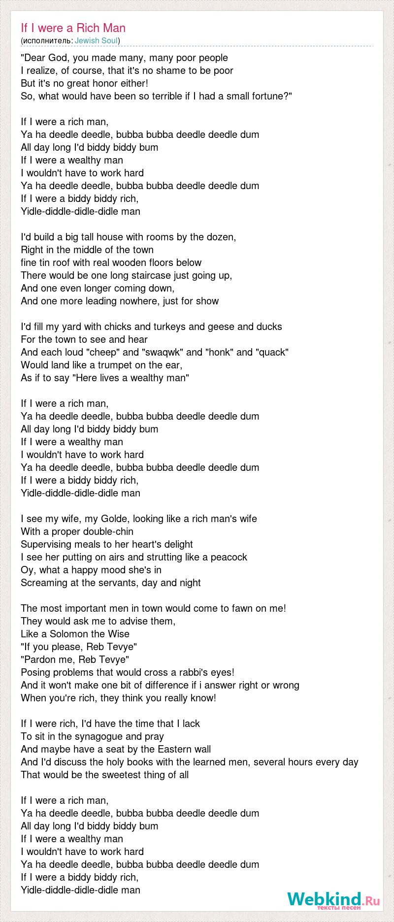 "Dear God, you made many, many poor people I realize, of course, that it's no shame to be poor But it's no great honor either! So, what would have been so terrible if I had a small fortune?" If I were a rich man, Ya ha deedle deedle, bubba bubba deedle deedle dum All day long I'd biddy biddy bum If I were a wealthy man I wouldn't have to work hard Ya ha deedle deedle, bubba bubba deedle deedle dum If I were a biddy biddy rich, Yidle-diddle-didle-didle man I'd build a big tall house with rooms by the dozen, Right in the middle of the town fine tin roof with real wooden floors below There would be one long staircase just going up, And one even longer coming down, And one more leading nowhere, just for show I'd fill my yard with chicks and turkeys and geese and ducks For the town to see and hear And each loud "cheep" and "swaqwk" and "honk" and "quack" Would land like a trumpet on the ear, As if to say "Here lives a wealthy man" If I were a rich man, Ya ha deedle deedle, bubba bubba deedle deedle dum All day long I'd biddy biddy bum If I were a wealthy man I wouldn't have to work hard Ya ha deedle deedle, bubba bubba deedle deedle dum If I were a biddy biddy rich, Yidle-diddle-didle-didle man I see my wife, my Golde, looking like a rich man's wife With a proper double-chin Supervising meals to her heart's delight I see her putting on airs and strutting like a peacock Oy, what a happy mood she's in Screaming at the servants, day and night The most important men in town would come to fawn on me! They would ask me to advise them, Like a Solomon the Wise "If you please, Reb Tevye" "Pardon me, Reb Tevye" Posing problems that would cross a rabbi's eyes! And it won't make one bit of difference if i answer right or wrong When you're rich, they think you really know! If I were rich, I'd have the time that I lack To sit in the synagogue and pray And maybe have a seat by the Eastern wall And I'd discuss the holy books with the learned men, several hours every day That would be the sweetest thing of all If I were a rich man, Ya ha deedle deedle, bubba bubba deedle deedle dum All day long I'd biddy biddy bum If I were a wealthy man I wouldn't have to work hard Ya ha deedle deedle, bubba bubba deedle deedle dum If I were a biddy biddy rich, Yidle-diddle-didle-didle man