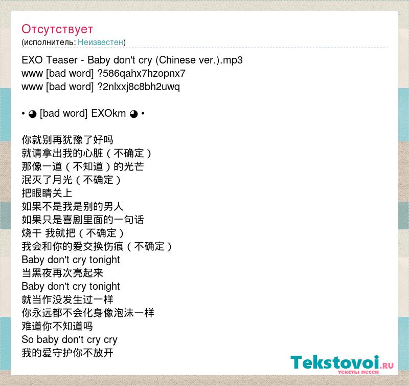 EXO Teaser - Baby don't cry (Chinese ver.).mp3 www [bad word] ?586qahx7hzopnx7 www [bad word] ?2nlxxj8c8bh2uwq • ◕ [bad word] EXOkm ◕ • 你就别再犹豫了好吗 就请拿出我的心脏(不确定) 那像一道(不知道)的光芒 泯灭了月光(不确定) 把眼睛关上 如果不是我是别的男人 如果只是喜剧里面的一句话 烧干 我就把(不确定) 我会和你的爱交换伤痕(不确定) Baby don't cry tonight 当黑夜再次亮起来 Baby don't cry tonight 就当作没发生过一样 你永远都不会化身像泡沫一样 难道你不知道吗 So baby don't cry cry 我的爱守护你不放开