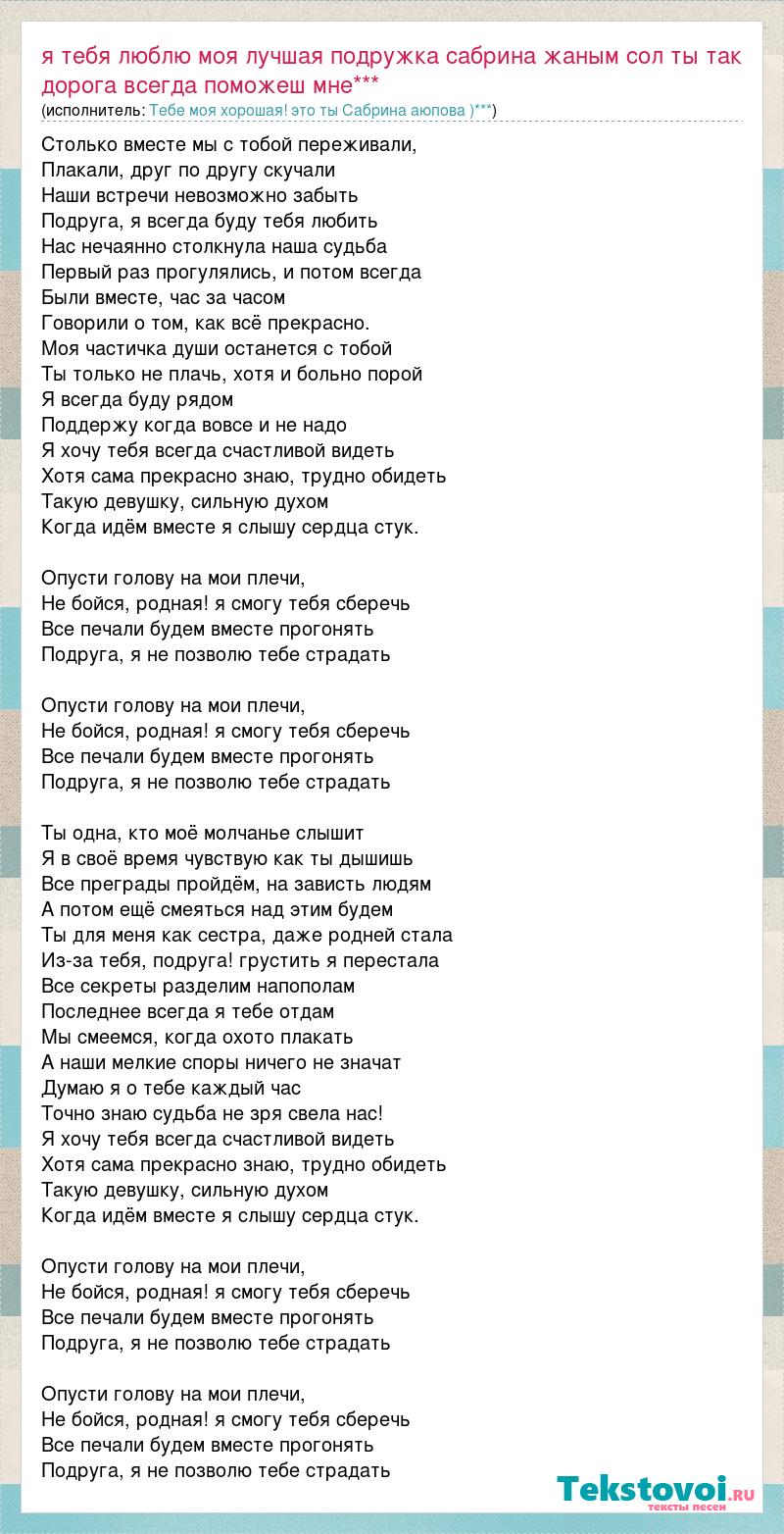 Столько вместе мы с тобой переживали, Плакали, друг по другу скучали Наши встречи невозможно забыть Подруга, я всегда буду тебя любить Нас нечаянно столкнула наша судьба Первый раз прогулялись, и потом всегда Были вместе, час за часом Говорили о том, как всё прекрасно. Моя частичка души останется с тобой Ты только не плачь, хотя и больно порой Я всегда буду рядом Поддержу когда вовсе и не надо Я хочу тебя всегда счастливой видеть Хотя сама прекрасно знаю, трудно обидеть Такую девушку, сильную духом Когда идём вместе я слышу сердца стук. Опусти голову на мои плечи, Не бойся, родная! я смогу тебя сберечь Все печали будем вместе прогонять Подруга, я не позволю тебе страдать Опусти голову на мои плечи, Не бойся, родная! я смогу тебя сберечь Все печали будем вместе прогонять Подруга, я не позволю тебе страдать Ты одна, кто моё молчанье слышит Я в своё время чувствую как ты дышишь Все преграды пройдём, на зависть людям А потом ещё смеяться над этим будем Ты для меня как сестра, даже родней стала Из-за тебя, подруга! грустить я перестала Все секреты разделим напополам Последнее всегда я тебе отдам Мы смеемся, когда охото плакать А наши мелкие споры ничего не значат Думаю я о тебе каждый час Точно знаю судьба не зря свела нас! Я хочу тебя всегда счастливой видеть Хотя сама прекрасно знаю, трудно обидеть Такую девушку, сильную духом Когда идём вместе я слышу сердца стук. Опусти голову на мои плечи, Не бойся, родная! я смогу тебя сберечь Все печали будем вместе прогонять Подруга, я не позволю тебе страдать Опусти голову на мои плечи, Не бойся, родная! я смогу тебя сберечь Все печали будем вместе прогонять Подруга, я не позволю тебе страдать