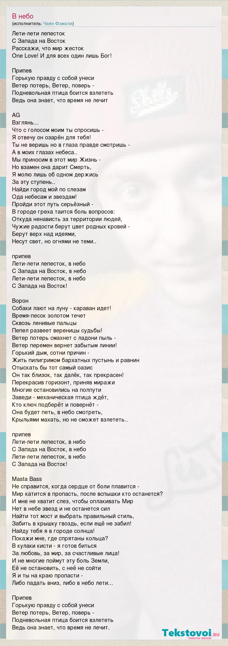 Лети-лети лепесток С Запада на Восток Расскажи, что мир жесток One Love! И для всех один лишь Бог! Припев Горькую правду с собой унеси Ветер потерь, Ветер, поверь - Подневольная птица боится взлететь Ведь она знает, что время не лечит AG Взглянь... Что с голосом моим ты спросишь - Я отвечу он озарён для тебя! Ты не веришь но в глаза правде смотришь - А в моих глазах небеса.. Мы приносим в этот мир Жизнь - Но взамен она дарит Смерть, Я молю лишь об одном держись За эту ступень.. Найди город мой по слезам Ода небесам и звездам! Пройди этот путь серьёзный - В городе греха таится боль вопросов: Откуда ненависть за территории людей, Чужие радости берут цвет родных кровей - Берут верх над идеями, Несут свет, но огнями не теми.. припев Лети-лети лепесток, в небо С Запада на Восток, в небо Лети-лети лепесток, в небо С Запада на Восток! Ворон Собаки лают на луну - караван идет! Время-песок золотом течет Сквозь ленивые пальцы Пепел развеет вереницы судьбы! Ветер потерь смахнет с ладони пыль - Ветер перемен вернет забытым линии! Горький дым, сотни причин - Жить пилигримом бархатных пустынь и равнин Отыскать бы тот самый оазис Он так близок, так далёк, так прекрасен! Перекрасив горизонт, приняв миражи Многие остановились на полпути Заведи - механическая птица ждёт, Кто ключ подберёт и повернёт - Она будет петь, в небо смотреть, Крыльями махать, но не сможет взлететь.. припев Лети-лети лепесток, в небо С Запада на Восток, в небо Лети-лети лепесток, в небо С Запада на Восток! Masta Bass Не справится, когда сердце от боли плавится - Мир катится в пропасть, после вспышки кто останется? И мне не хватит слез, чтобы оплакивать Мир Нет в небе звезд и не останется сил Найти тот мост и выбрать правильный стиль, Забить в крышку гвоздь, если ещё не забил! Найду тебя я в городе солнца! Покажи мне, где спрятаны кольца? В кулаки кисти - я готов биться За любовь, за мир, за счастливые лица! И не многие поймут эту боль Земли, Её не остановить, с неё не сойти Я и ты на краю пропасти - Либо падать вниз, либо в небо лети... Припев Горькую правду с собой унеси Ветер потерь, Ветер, поверь - Подневольная птица боится взлететь Ведь она знает, что время не лечит.