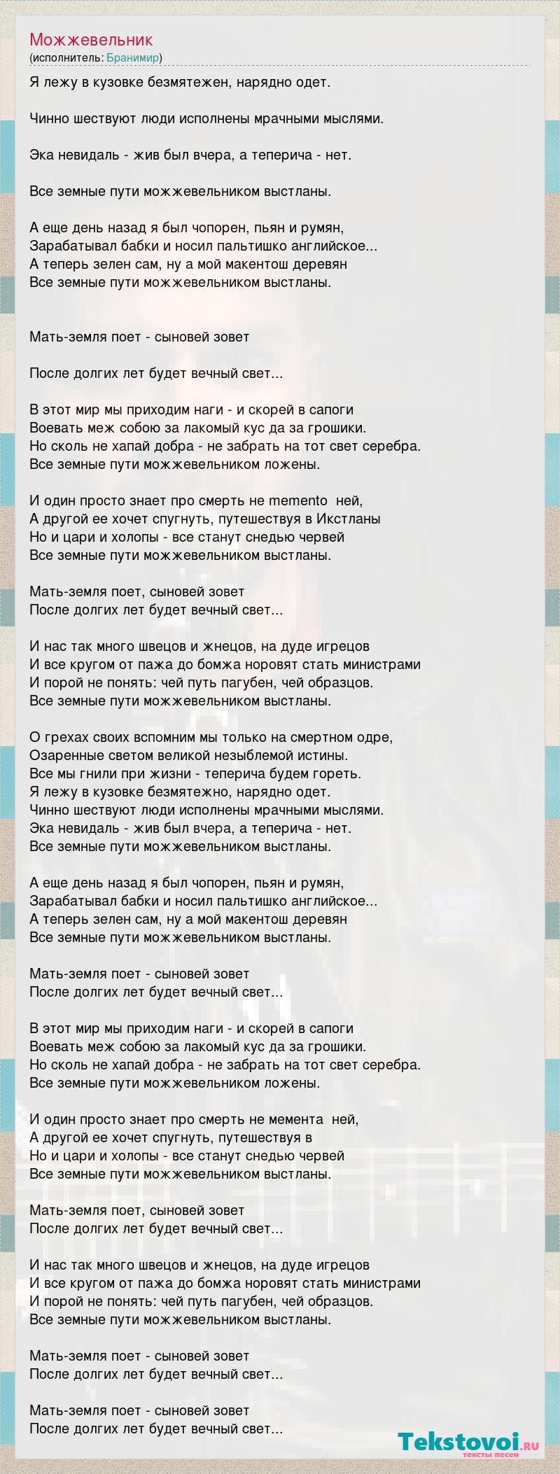 Я лежу в кузовке безмятежен, нарядно одет. Чинно шествуют люди исполнены мрачными мыслями. Эка невидаль - жив был вчера, а теперича - нет. Все земные пути можжевельником выстланы. А еще день назад я был чопорен, пьян и румян, Зарабатывал бабки и носил пальтишко английское... А теперь зелен сам, ну а мой макентош деревян Все земные пути можжевельником выстланы. Мать-земля поет - сыновей зовет После долгих лет будет вечный свет... В этот мир мы приходим наги - и скорей в сапоги Воевать меж собою за лакомый кус да за грошики. Но сколь не хапай добра - не забрать на тот свет серебра. Все земные пути можжевельником ложены. И один просто знает про смерть не memento ней, А другой ее хочет спугнуть, путешествуя в Икстланы Но и цари и холопы - все станут снедью червей Все земные пути можжевельником выстланы. Мать-земля поет, сыновей зовет После долгих лет будет вечный свет... И нас так много швецов и жнецов, на дуде игрецов И все кругом от пажа до бомжа норовят стать министрами И порой не понять: чей путь пагубен, чей образцов. Все земные пути можжевельником выстланы. О грехах своих вспомним мы только на смертном одре, Озаренные светом великой незыблемой истины. Все мы гнили при жизни - теперича будем гореть. Я лежу в кузовке безмятежно, нарядно одет. Чинно шествуют люди исполнены мрачными мыслями. Эка невидаль - жив был вчера, а теперича - нет. Все земные пути можжевельником выстланы. А еще день назад я был чопорен, пьян и румян, Зарабатывал бабки и носил пальтишко английское... А теперь зелен сам, ну а мой макентош деревян Все земные пути можжевельником выстланы. Мать-земля поет - сыновей зовет После долгих лет будет вечный свет... В этот мир мы приходим наги - и скорей в сапоги Воевать меж собою за лакомый кус да за грошики. Но сколь не хапай добра - не забрать на тот свет серебра. Все земные пути можжевельником ложены. И один просто знает про смерть не мемента ней, А другой ее хочет спугнуть, путешествуя в Но и цари и холопы - все станут снедью червей Все земные пути можжевельником выстланы. Мать-земля поет, сыновей зовет После долгих лет будет вечный свет... И нас так много швецов и жнецов, на дуде игрецов И все кругом от пажа до бомжа норовят стать министрами И порой не понять: чей путь пагубен, чей образцов. Все земные пути можжевельником выстланы. Мать-земля поет - сыновей зовет После долгих лет будет вечный свет... Мать-земля поет - сыновей зовет После долгих лет будет вечный свет...