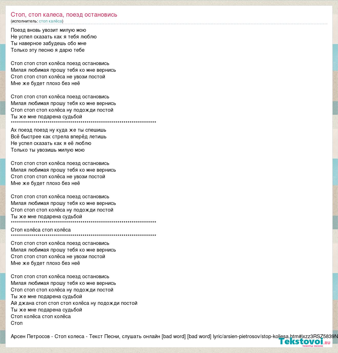 Поезд вновь увозит милую мою Не успел сказать как я тебя люблю Ты наверное забудешь обо мне Только эту песню я дарю тебе Стоп стоп стоп колёса поезд остановись Милая любимая прошу тебя ко мне вернись Стоп стоп стоп колёса не увози постой Мне же будет плохо без неё Стоп стоп стоп колёса поезд остановись Милая любимая прошу тебя ко мне вернись Стоп стоп стоп колёса ну подожди постой Ты же мне подарена судьбой *********************************************************************** Ах поезд поезд ну куда же ты спешишь Всё быстрее как стрела вперёд летишь Не успел сказать как я её люблю Только ты увозишь милую мою Стоп стоп стоп колёса поезд остановись Милая любимая прошу тебя ко мне вернись Стоп стоп стоп колёса не увози постой Мне же будет плохо без неё Стоп стоп стоп колёса поезд остановись Милая любимая прошу тебя ко мне вернись Стоп стоп стоп колёса ну подожди постой Ты же мне подарена судьбой *********************************************************************** Стоп колёса стоп колёса *********************************************************************** Стоп стоп стоп колёса поезд остановись Милая любимая прошу тебя ко мне вернись Стоп стоп стоп колёса не увози постой Мне же будет плохо без неё Стоп стоп стоп колёса поезд остановись Милая любимая прошу тебя ко мне вернись Стоп стоп стоп колёса ну подожди постой Ты же мне подарена судьбой Ай джана стоп стоп стоп колёса ну подожди постой Ты же мне подарена судьбой Стоп колёса стоп колёса Стоп Арсен Петросов - Стоп колеса - Текст Песни, слушать онлайн [bad word] [bad word] lyric/arsien-pietrosov/stop-koliesa.htm#ixzz3RSZ5839N