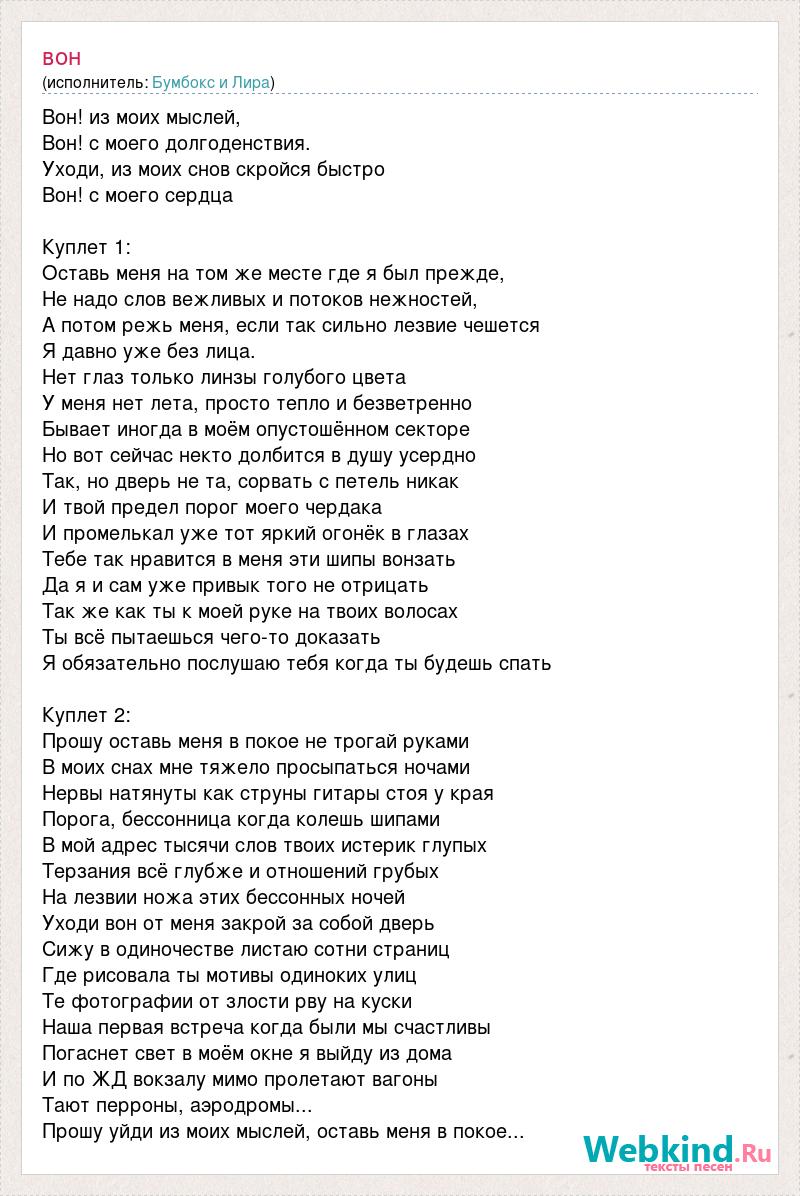 Вон! из моих мыслей, Вон! с моего долгоденствия. Уходи, из моих снов скройся быстро Вон! с моего сердца Куплет 1: Оставь меня на том же месте где я был прежде, Не надо слов вежливых и потоков нежностей, А потом режь меня, если так сильно лезвие чешется Я давно уже без лица. Нет глаз только линзы голубого цвета У меня нет лета, просто тепло и безветренно Бывает иногда в моём опустошённом секторе Но вот сейчас некто долбится в душу усердно Так, но дверь не та, сорвать с петель никак И твой предел порог моего чердака И промелькал уже тот яркий огонёк в глазах Тебе так нравится в меня эти шипы вонзать Да я и сам уже привык того не отрицать Так же как ты к моей руке на твоих волосах Ты всё пытаешься чего-то доказать Я обязательно послушаю тебя когда ты будешь спать Куплет 2: Прошу оставь меня в покое не трогай руками В моих снах мне тяжело просыпаться ночами Нервы натянуты как струны гитары стоя у края Порога, бессонница когда колешь шипами В мой адрес тысячи слов твоих истерик глупых Терзания всё глубже и отношений грубых На лезвии ножа этих бессонных ночей Уходи вон от меня закрой за собой дверь Сижу в одиночестве листаю сотни страниц Где рисовала ты мотивы одиноких улиц Те фотографии от злости рву на куски Наша первая встреча когда были мы счастливы Погаснет свет в моём окне я выйду из дома И по ЖД вокзалу мимо пролетают вагоны Тают перроны, аэродромы... Прошу уйди из моих мыслей, оставь меня в покое...