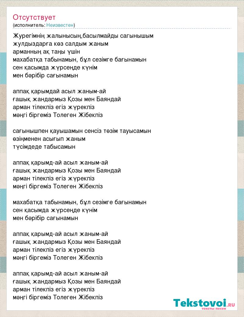 Журегімнің жалынысың,басылмайды сагынышым жулдыздарға көз салдым жаным арманның ақ таңы үшін махабатқа табынамын, бұл сезімге бағынамын сен қасымда жүрсеңде күнім мен бәрібір сағынамын аппақ қарымдай асыл жаным-ай ғашық жандармыз Қозы мен Баяндай арман тілекпіз егіз жүрекпіз мәңгі біргеміз Толеген Жібекпіз сағынышпен қауышамын сенсіз төзім тауысамын өзіңменен асығып жаным түсімдеде табысамын аппақ қарымд-ай асыл жаным-ай ғашық жандармыз Қозы мен Баяндай арман тілекпіз егіз жүрекпіз мәңгі біргеміз Толеген Жібекпіз махабатқа табынамын, бұл сезімге бағынамын сен қасымда жүрсеңде күнім мен бәрібір сағынамын аппақ қарымд-ай асыл жаным-ай ғашық жандармыз Қозы мен Баяндай арман тілекпіз егіз жүрекпіз мәңгі біргеміз Толеген Жібекпіз аппақ қарымд-ай асыл жаным-ай ғашық жандармыз Қозы мен Баяндай арман тілекпіз егіз жүрекпіз мәңгі біргеміз Толеген Жібекпіз