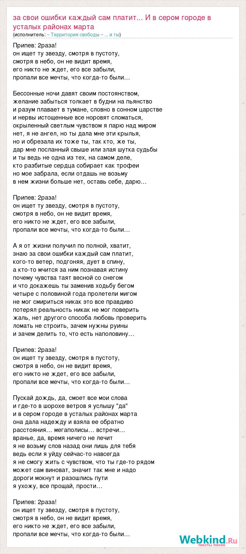 Главная→Исполнители→~ Территория свободы ~ ... и ты→За свои ошибки каждый сам платит... И в сером городе в усталых районах марта