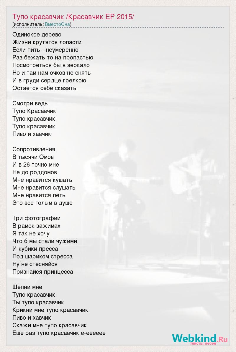 Одинокое дерево Жизни крутятся лопасти Если пить - неумеренно Раз бежать то на пропастью Посмотреться бы в зеркало Но и там нам очков не снять И в груди сердце грелкою Остается себе сказать Смотри ведь Тупо Красавчик Тупо красавчик Тупо красавчик Пиво и хавчик Сопротивления В тысячи Омов И в 26 точно мне Не до роддомов Мне нравится кушать Мне нравится слушать Мне нравится петь Это все голым в душе Три фотографии В рамок зажимах Я так не хочу Что б мы стали чужими И кубики пресса Под шариком стресса Ну не стесняйся Признайся принцесса Шепни мне Тупо красавчик Ты тупо красавчик Крикни мне тупо красавчик Пиво и хавчик Скажи мне тупо красавчик Еще раз тупо красавчик е-ееееее