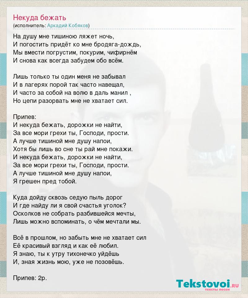 На душу мне тишиною ляжет ночь, И погостить придёт ко мне бродяга-дождь, Мы вмести погрустим, покурим, чифирнём И снова как всегда забудем обо всём. Лишь только ты один меня не забывал И в лагерях порой так часто навещал, И часто за собой на волю в даль манил , Но цепи разорвать мне не хватает сил. Припев: И некуда бежать, дорожки не найти, За все мори грехи ты, Господи, прости. А лучше тишиной мне душу напои, Хотя бы лишь во сне ты рай мне покажи. И некуда бежать, дорожки не найти, За все мори грехи ты, Господи, прости. А лучше тишиной мне душу напои, Я грешен пред тобой. Куда дойду сквозь седую пыль дорог И где найду ли я свой счастья уголок? Осколков не собрать разбившейся мечты, Лишь можно вспоминать, о чём мечтали мы. Всё в прошлом, но забыть мне не хватает сил Её красивый взгляд и как её любил. Я знаю, ты к утру тихонечко уйдёшь И, зная жизнь мою, уже не позовёшь. Припев: 2р.