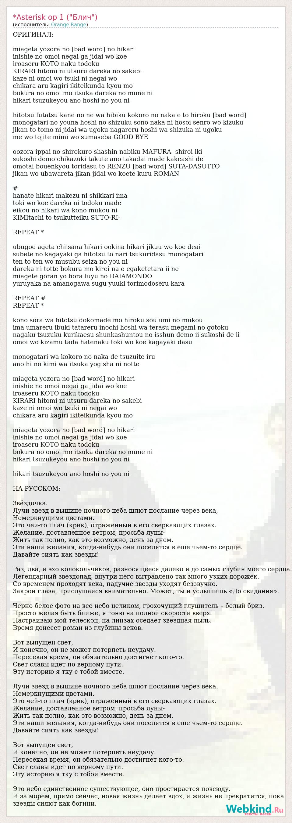 ОРИГИНАЛ: miageta yozora no [bad word] no hikari inishie no omoi negai ga jidai wo koe iroaseru KOTO naku todoku KIRARI hitomi ni utsuru dareka no sakebi kaze ni omoi wo tsuki ni negai wo chikara aru kagiri ikiteikunda kyou mo bokura no omoi mo itsuka dareka no mune ni hikari tsuzukeyou ano hoshi no you ni hitotsu futatsu kane no ne wa hibiku kokoro no naka e to hiroku [bad word] monogatari no youna hoshi no shizuku sono naka ni hosoi senro wo kizuku jikan to tomo ni jidai wa ugoku nagareru hoshi wa shizuka ni ugoku me wo tojite mimi wo sumaseba GOOD BYE oozora ippai no shirokuro shashin nabiku MAFURA- shiroi iki sukoshi demo chikazuki takute ano takadai made kakeashi de omotai bouenkyou toridasu to RENZU [bad word] SUTA-DASUTTO jikan wo ubawareta jikan jidai wo koete kuru ROMAN # hanate hikari makezu ni shikkari ima toki wo koe dareka ni todoku made eikou no hikari wa kono mukou ni KIMItachi to tsukutteiku SUTO-RI- REPEAT * ubugoe ageta chiisana hikari ookina hikari jikuu wo koe deai subete no kagayaki ga hitotsu to nari tsukuridasu monogatari ten to ten wo musubu seiza no you ni dareka ni totte bokura mo kirei na e egaketetara ii ne miagete goran yo hora fuyu no DAIAMONDO yuruyaka na amanogawa sugu yuuki torimodoseru kara REPEAT # REPEAT * kono sora wa hitotsu dokomade mo hiroku sou umi no mukou ima umareru ibuki tatareru inochi hoshi wa terasu megami no gotoku nagaku tsuzuku kurikaesu shunkashuntou no isshun demo ii sukoshi de ii omoi wo kizamu tada hatenaku toki wo koe kagayaki dasu monogatari wa kokoro no naka de tsuzuite iru ano hi no kimi wa itsuka yogisha ni notte miageta yozora no [bad word] no hikari inishie no omoi negai ga jidai wo koe iroaseru KOTO naku todoku KIRARI hitomi ni utsuru dareka no sakebi kaze ni omoi wo tsuki ni negai wo chikara aru kagiri ikiteikunda kyou mo miageta yozora no [bad word] no hikari inishie no omoi negai ga jidai wo koe iroaseru KOTO naku todoku bokura no omoi mo itsuka dareka no mune ni hikari tsuzukeyou ano hoshi no you ni hikari tsuzukeyou ano hoshi no you ni НА РУССКОМ: Звёздочка. Лучи звезд в вышине ночного неба шлют послание через века, Немеркнущими цветами. Это чей-то плач (крик), отраженный в его сверкающих глазах. Желание, доставленное ветром, просьба луны- Жить так полно, как это возможно, день за днем. Эти наши желания, когда-нибудь они поселятся в еще чьем-то сердце. Давайте сиять как звезды! Раз, два, и эхо колокольчиков, разносящееся далеко и до самых глубин моего сердца. Легендарный звездопад, внутри него вытравлено так много узких дорожек. Со временем проходят века, падучие звезды уходят беззвучно. Закрой глаза, прислушайся внимательно. Может, ты и услышишь «До свидания». Черно-белое фото на все небо целиком, грохочущий глушитель – белый бриз. Просто желая быть ближе, я гоню на полной скорости вверх. Настраиваю мой телескоп, на линзах оседает звездная пыль. Время донесет роман из глубины веков. Вот выпущен свет, И конечно, он не может потерпеть неудачу. Пересекая время, он обязательно достигнет кого-то. Свет славы идет по верному пути. Эту историю я тку с тобой вместе. Лучи звезд в вышине ночного неба шлют послание через века, Немеркнущими цветами. Это чей-то плач (крик), отраженный в его сверкающих глазах. Желание, доставленное ветром, просьба луны- Жить так полно, как это возможно, день за днем. Эти наши желания, когда-нибудь они поселятся в еще чьем-то сердце. Давайте сиять как звезды! Вот выпущен свет, И конечно, он не может потерпеть неудачу. Пересекая время, он обязательно достигнет кого-то. Свет славы идет по верному пути. Эту историю я тку с тобой вместе. Это небо единственное существующее, оно простирается повсюду. И за морем, прямо сейчас, новая жизнь делает вдох, и жизнь не прекратится, пока звезды сияют как богини.