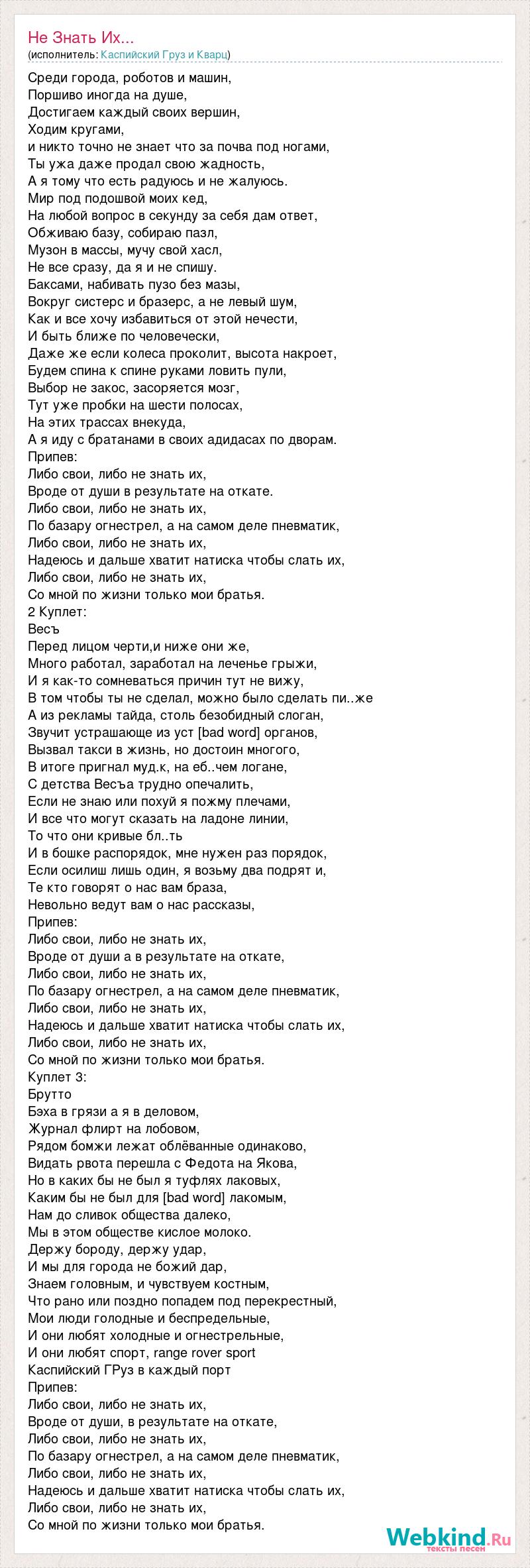 Среди города, роботов и машин, Поршиво иногда на душе, Достигаем каждый своих вершин, Ходим кругами, и никто точно не знает что за почва под ногами, Ты ужа даже продал свою жадность, А я тому что есть радуюсь и не жалуюсь. Мир под подошвой моих кед, На любой вопрос в секунду за себя дам ответ, Обживаю базу, собираю пазл, Музон в массы, мучу свой хасл, Не все сразу, да я и не спишу. Баксами, набивать пузо без мазы, Вокруг систерс и бразерс, а не левый шум, Как и все хочу избавиться от этой нечести, И быть ближе по человечески, Даже же если колеса проколит, высота накроет, Будем спина к спине руками ловить пули, Выбор не закос, засоряется мозг, Тут уже пробки на шести полосах, На этих трассах внекуда, А я иду с братанами в своих адидасах по дворам. Припев: Либо свои, либо не знать их, Вроде от души в результате на откате. Либо свои, либо не знать их, По базару огнестрел, а на самом деле пневматик, Либо свои, либо не знать их, Надеюсь и дальше хватит натиска чтобы слать их, Либо свои, либо не знать их, Со мной по жизни только мои братья. 2 Куплет: Весъ Перед лицом черти,и ниже они же, Много работал, заработал на леченье грыжи, И я как-то сомневаться причин тут не вижу, В том чтобы ты не сделал, можно было сделать пи..же А из рекламы тайда, столь безобидный слоган, Звучит устрашающе из уст [bad word] органов, Вызвал такси в жизнь, но достоин многого, В итоге пригнал муд.к, на еб..чем логане, С детства Весъа трудно опечалить, Если не знаю или похуй я пожму плечами, И все что могут сказать на ладоне линии, То что они кривые бл..ть И в бошке распорядок, мне нужен раз порядок, Если осилиш лишь один, я возьму два подрят и, Те кто говорят о нас вам браза, Невольно ведут вам о нас рассказы, Припев: Либо свои, либо не знать их, Вроде от души а в результате на откате, Либо свои, либо не знать их, По базару огнестрел, а на самом деле пневматик, Либо свои, либо не знать их, Надеюсь и дальше хватит натиска чтобы слать их, Либо свои, либо не знать их, Со мной по жизни только мои братья. Куплет 3: Брутто Бэха в грязи а я в деловом, Журнал флирт на лобовом, Рядом бомжи лежат облёванные одинаково, Видать рвота перешла с Федота на Якова, Но в каких бы не был я туфлях лаковых, Каким бы не был для [bad word] лакомым, Нам до сливок общества далеко, Мы в этом обществе кислое молоко. Держу бороду, держу удар, И мы для города не божий дар, Знаем головным, и чувствуем костным, Что рано или поздно попадем под перекрестный, Мои люди голодные и беспредельные, И они любят холодные и огнестрельные, И они любят спорт, range rover sport Каспийский ГРуз в каждый порт Припев: Либо свои, либо не знать их, Вроде от души, в результате на откате, Либо свои, либо не знать их, По базару огнестрел, а на самом деле пневматик, Либо свои, либо не знать их, Надеюсь и дальше хватит натиска чтобы слать их, Либо свои, либо не знать их, Со мной по жизни только мои братья.